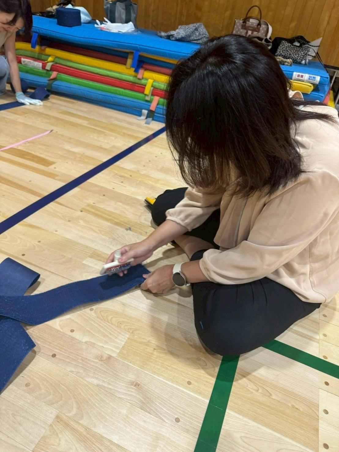 YOCSでは、2か月に1度、パパママたちによる「ベルクロお掃除」を行っています。「ベルクロ」とは、チアのマットとマットを繋ぎ合わせるために貼っている「長いマジックテープ」のことです。