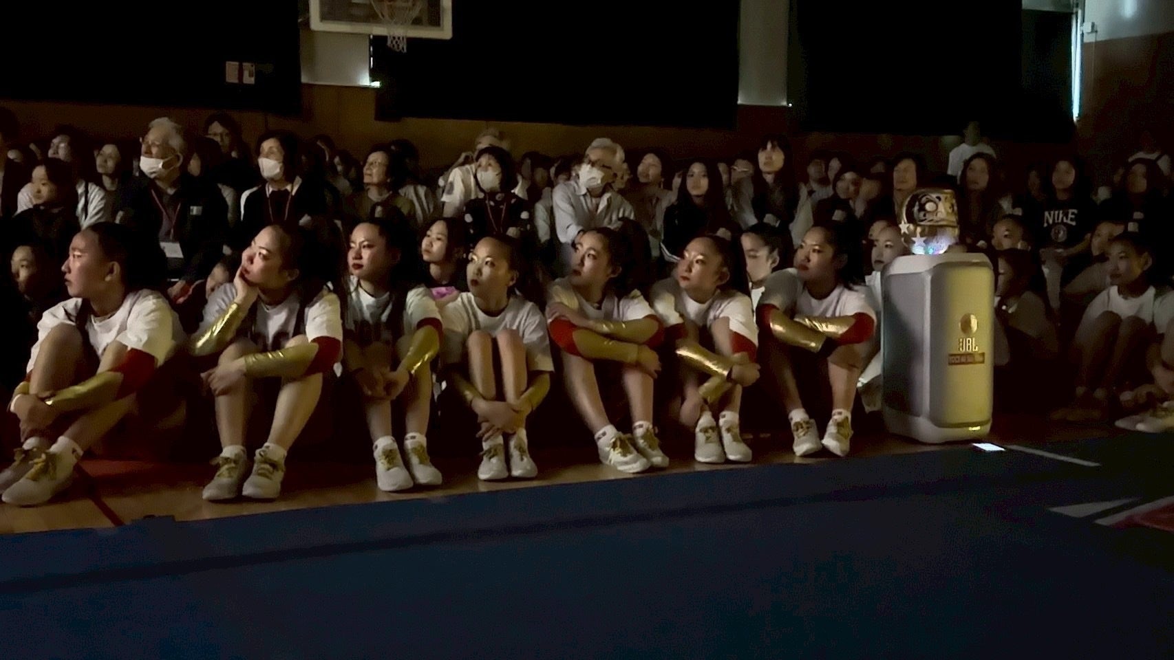 続いて上映されたのは、保護者からの応援動画です。メンバー一人ひとりの幼い頃の写真や家族との思い出、そして心のこもったメッセージを、HIPPYさんの「We Can Make It」の楽曲にのせて届けました。今こうしてチアリーディングに打ち込めているのは、本人の努力はもちろん、家族の支えがあってこそだということを、全員で再確認することができたとても感動的な映像となりました。上映後には、会場にいる全員で「Go! GOLD!!」と力強いエールを送りました。
