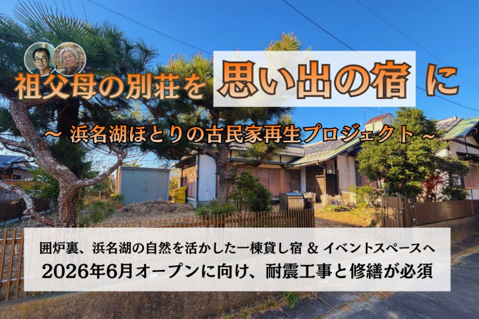 静岡県浜松市の弁天島にある祖父母の古民家を修繕し、1日1組限定の一棟貸し宿泊施設として甦らせるとともに、いずれは地域の方々や旅人が集い交流できるイベントスペースとしても活用したいと思っています。思い出の詰まった古民家にもう一度光を当て、新しい価値と賑わいを生み出す場所にすることが本プロジェクトの目標です。