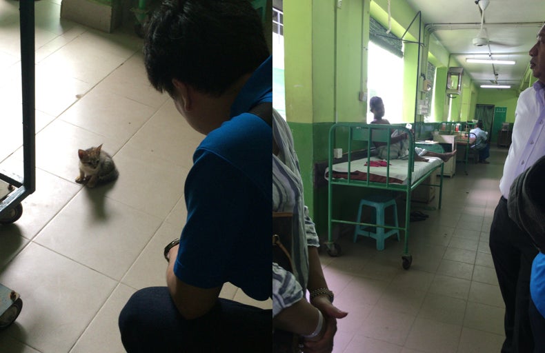 画像はデング熱流行中の病院内の様子です。入院室に入りきれない患者は廊下にベッドを置いたりゴザを敷いたりしてその上で2週間過ごします。