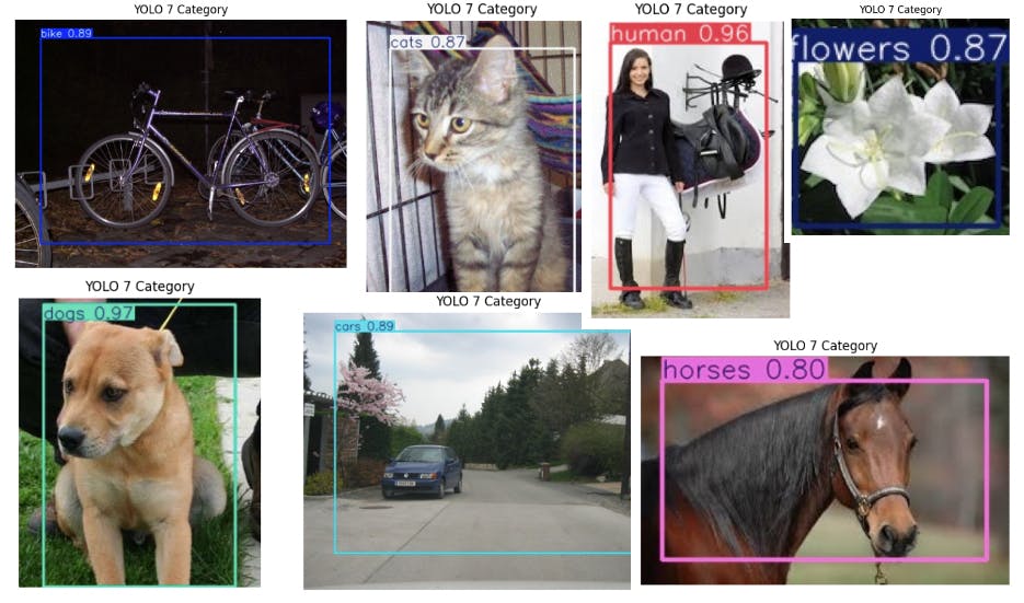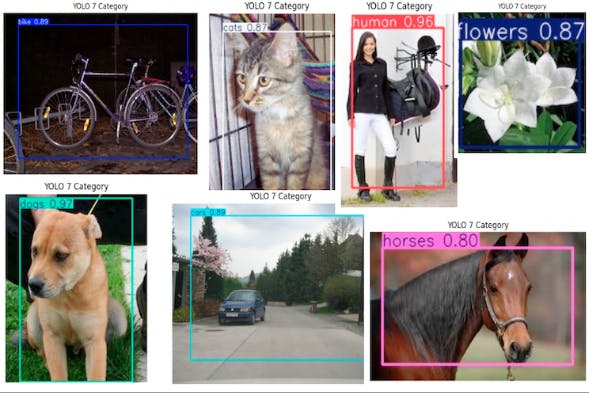 d. 7カテゴリーの物体検出器(犬、猫、馬、人、自転車、車、花の判定)