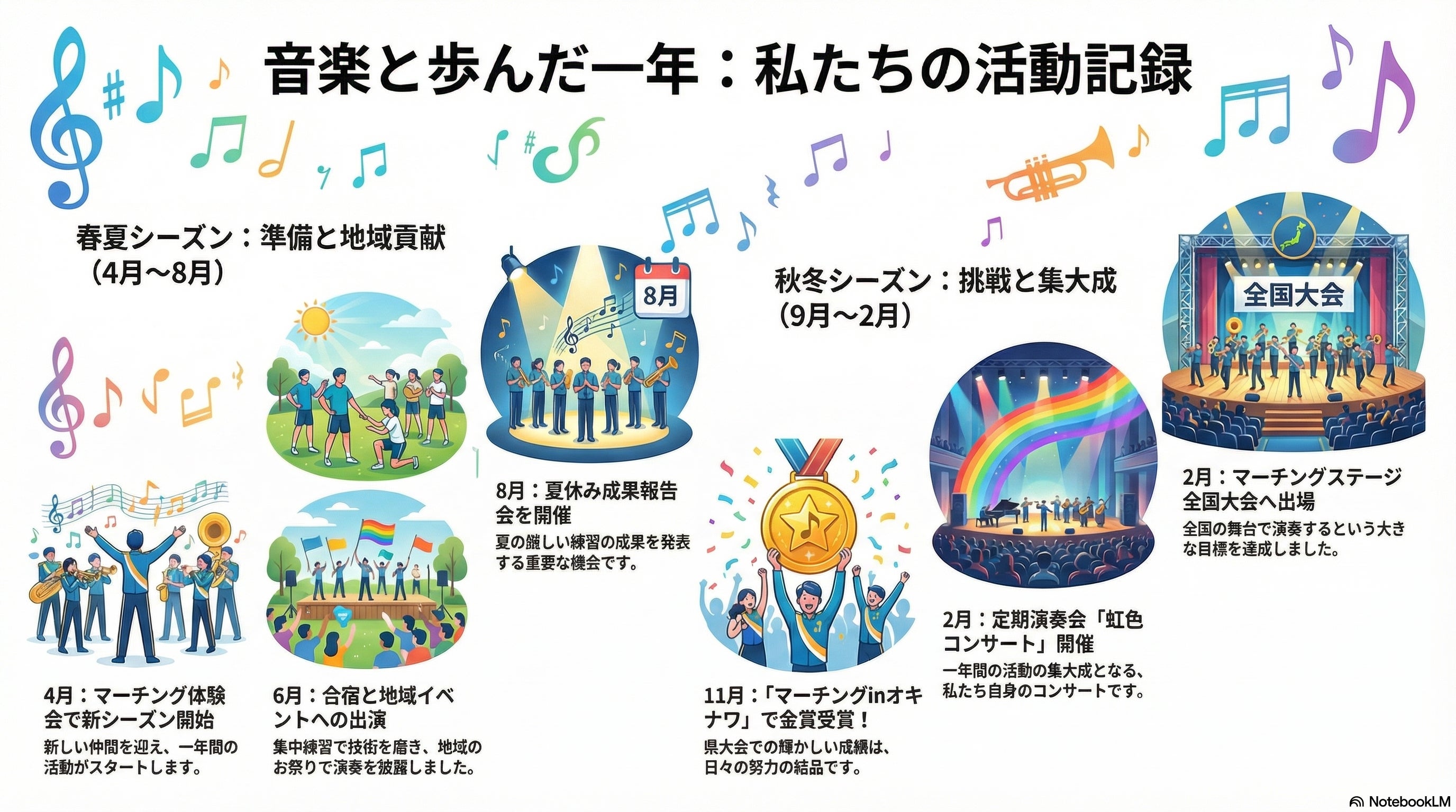 大会への出場のほか、地域イベントへの出演、毎年恒例の「虹色コンサート」を開催するなど、地域に根差した活動を行っております。