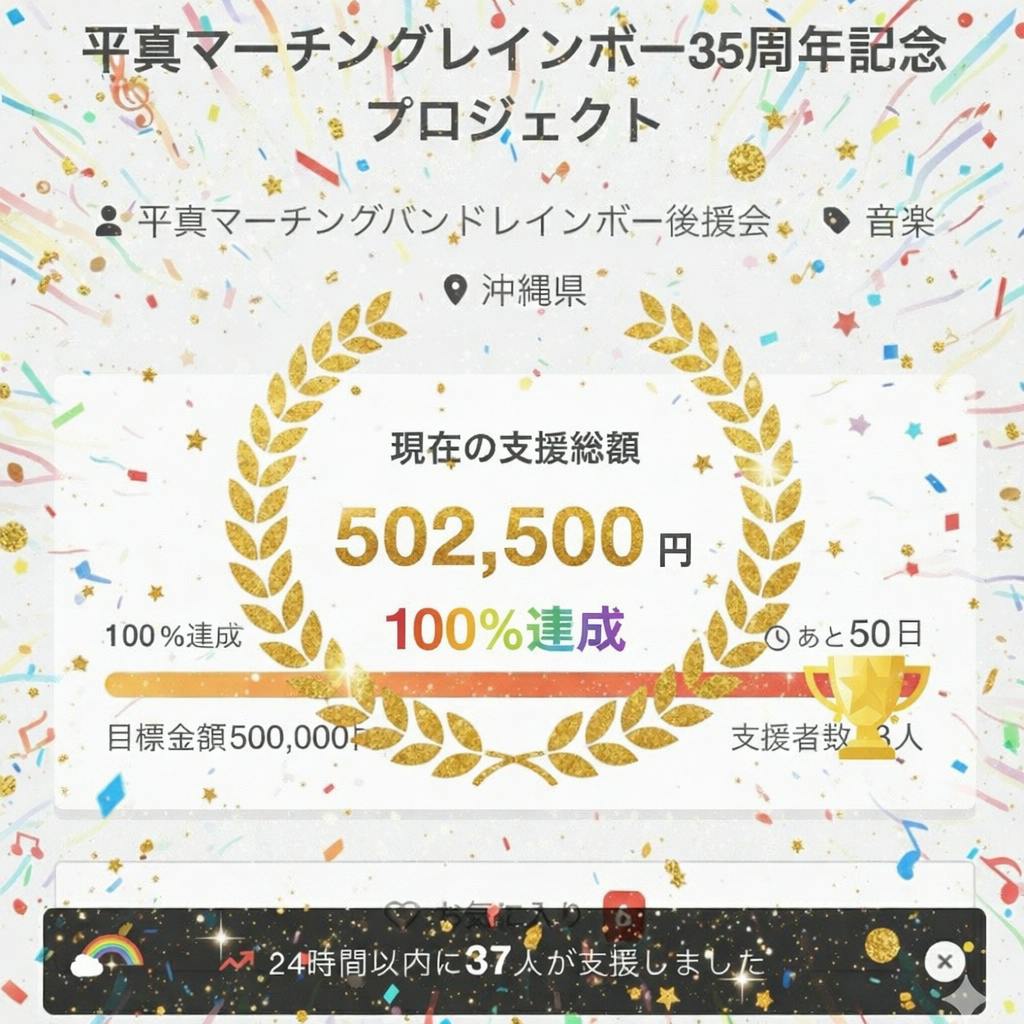 平真マーチングバンドレインボー後援会です。お昼に60%達成を報告したばかりですが、皆さまの温かいご支援のおかげで、目標金額の50万円を達成することができました!35周年という大きな節目に、これほど多くの方々が私たちの活動を応援してくださっていることを実感し、メンバー一同、感謝の気持ちでいっぱいです。しかし、私たちの挑戦はここで終わりではありません。「平真マーチングバンドレインボー」の音色をより遠くへ、そして子どもたちの練習環境をさらに充実させるため、【ネクストゴール:100万円】という新たな目標を掲げることを決意いたしました!追加でいただくご支援は、老朽化した楽器のメンテナンスや、今後の遠征費の積み立てなどに大切に活用させていただきます。プロジェクト終了まで、残り50日。最後まで走り抜けますので、引き続きの応援、そしてSNS等での拡散によるお力添えをよろしくお願い申し上げます!