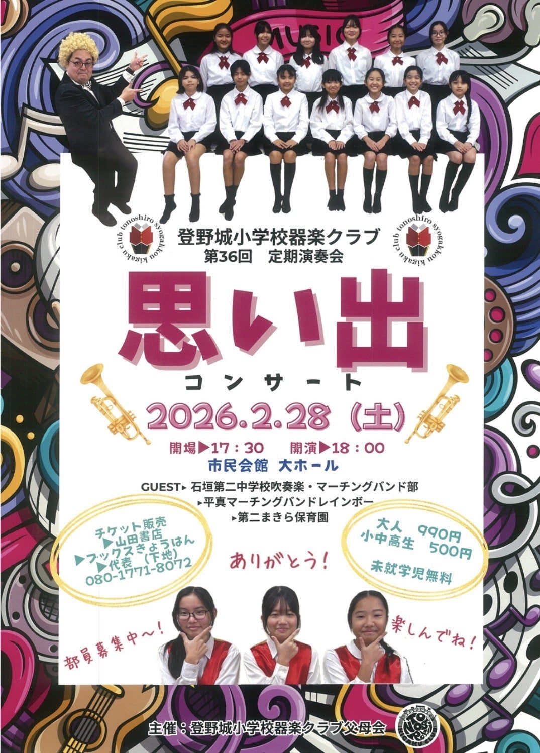 明日(2月28日(土))開催される、登野城小学校器楽クラブさんの定期演奏会「思い出コンサート」にゲスト出演いたします。
