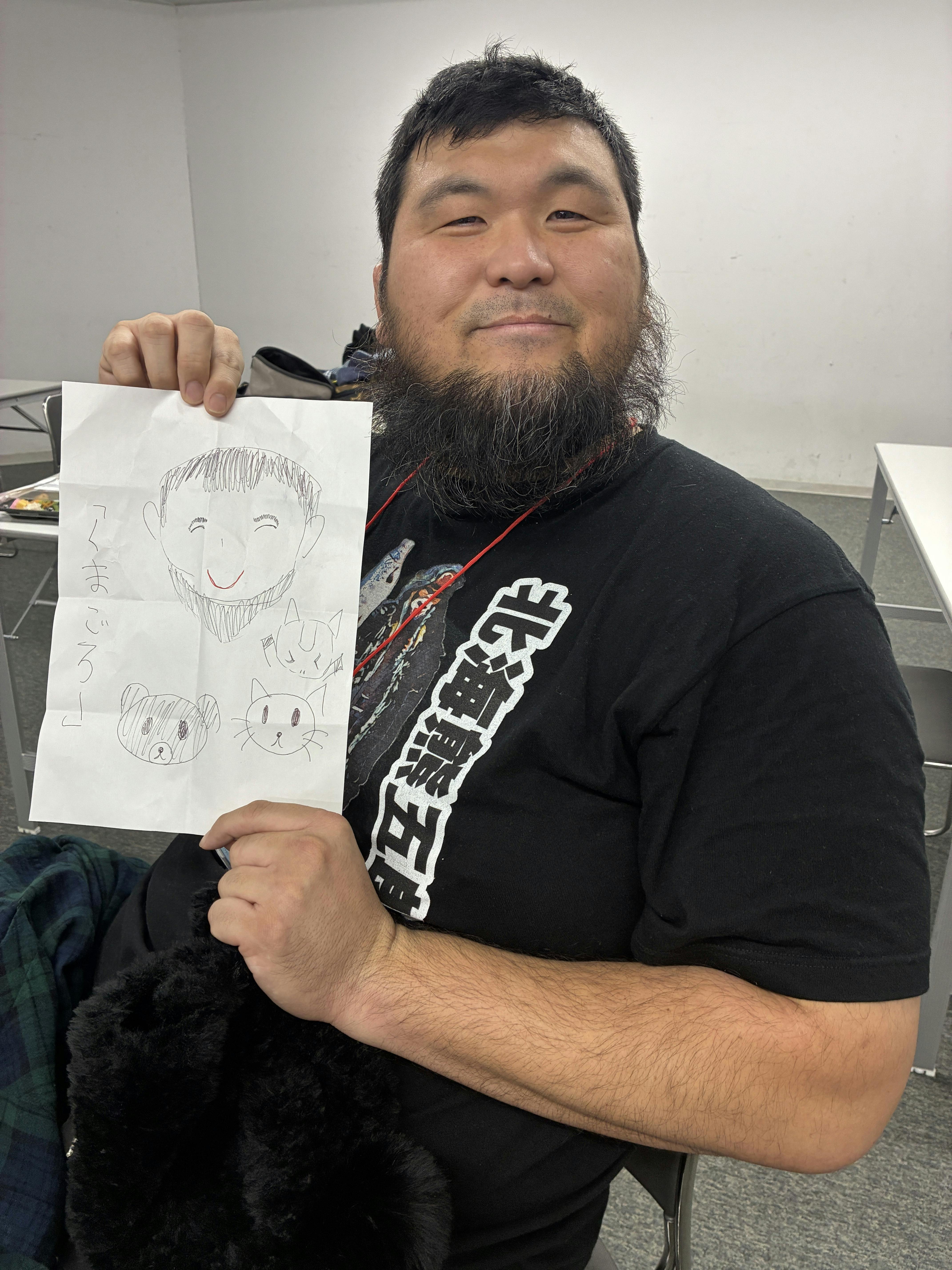 杉浦マネージャーは熊五郎さんの似顔絵を観にきた子どもからもらいました!