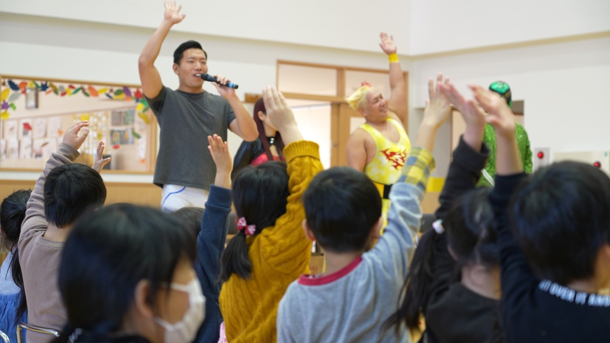 プロレスラーが訪問すると、子どもたちは目を輝かせ、自然と笑顔が広がります。