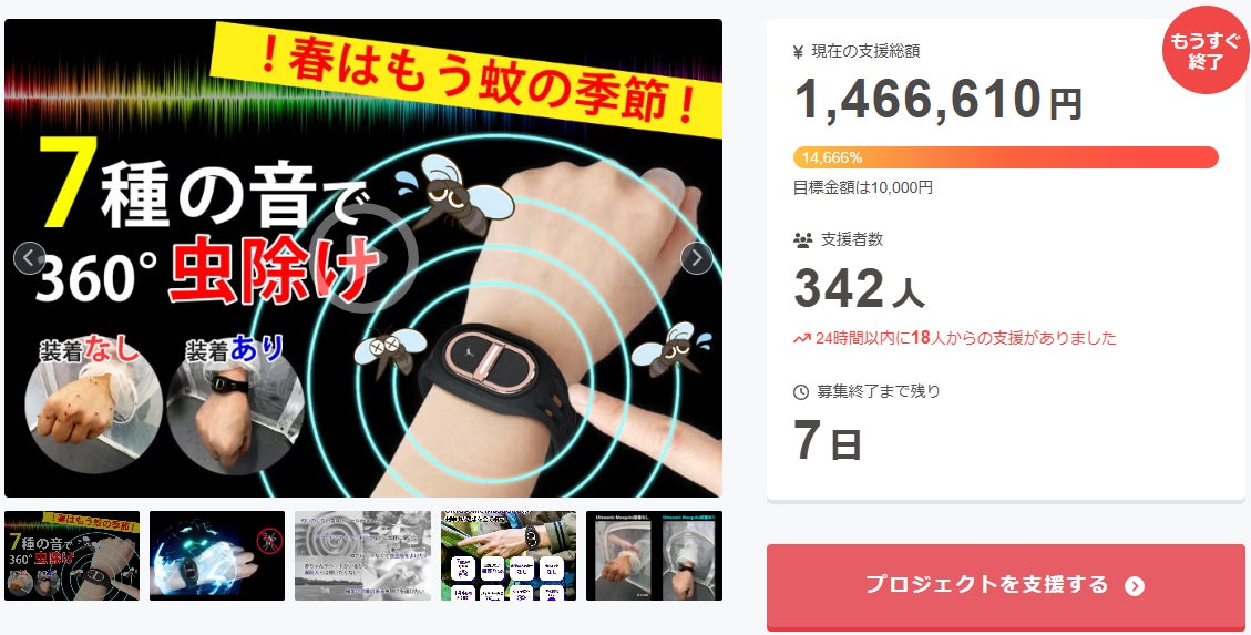 プロジェクト終了後、「春はもう蚊の季節!赤ちゃんやペットにも使える、7種の音波で全方位虫よけバンド」をCamfire特別価格で入手することはできなくなりますので、ご支援がまだの方、追加支援 をご検討の方はお急ぎくださいますようお願い申し上げます。