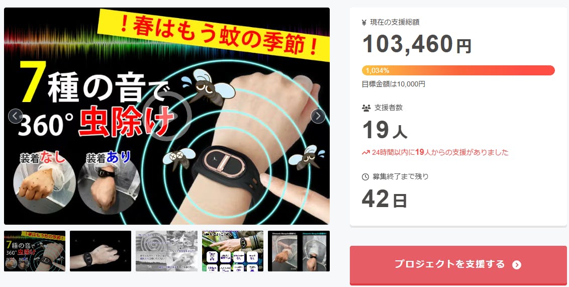 2026/03/19 11:37この度は「春はもう蚊の季節!赤ちゃんやペットにも使える、7種の音波で全方位虫よけバンド」に支援頂き誠にありがとうございます!お陰様で、開始から10分経たずに10万円の目標金額を100%達成することができました。ご興味のある方、ぜひ支援お願い致します。https://camp-fire.jp/projects/911818/viewBrightチームは、当プロジェクトをもっと多くの方に知っていただきたいと考えております。よかったら、FacebookやTwitter等のSNSでのシェア・拡散をお願い致します。#brightdiyどうぞよろしくお願い致します。Brightチーム もっと見る