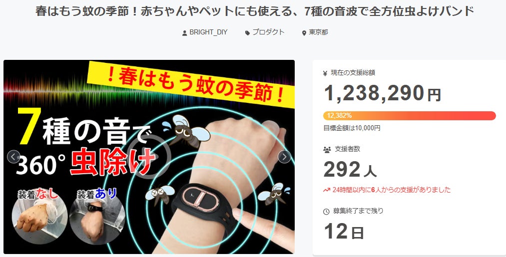 2026/04/18 12:00この度は「春はもう蚊の季節!赤ちゃんやペットにも使える、7種の音波で全方位虫よけバンド」に支援頂き誠にありがとうございます!お陰様で、支援総額120万円達成することができました。ご興味のある方、ぜひ支援お願い致します。https://camp-fire.jp/projects/911818/viewBrightチームは、当プロジェクトをもっと多くの方に知っていただきたいと考えております。よかったら、FacebookやTwitter等のSNSでのシェア・拡散をお願い致します。#brightdiyどうぞよろしくお願い致します。Brightチーム もっと見る
