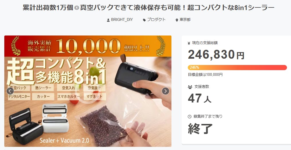 ご支援者様、累計出荷数1万個◎真空パックできて液体保存も可能!超コンパクトな8in1シーラーにご興味をお持ちいただきありがとうございます。プロジェクト開始から39日目で47人ものご支援者の方々より支援頂き、無事プロジェクト終了を迎えることが出来ました。早速皆様のリターンを2026年05月末にお届けできるよう準備を始めております!皆様にご満足いただけるリターンをお届けできるよう、全力で取り組んで参りますので引き続き、「累計出荷数1万個◎真空パックできて液体保存も可能!超コンパクトな8in1シーラー」をよろしくお願い致します。BRIGHTチーム