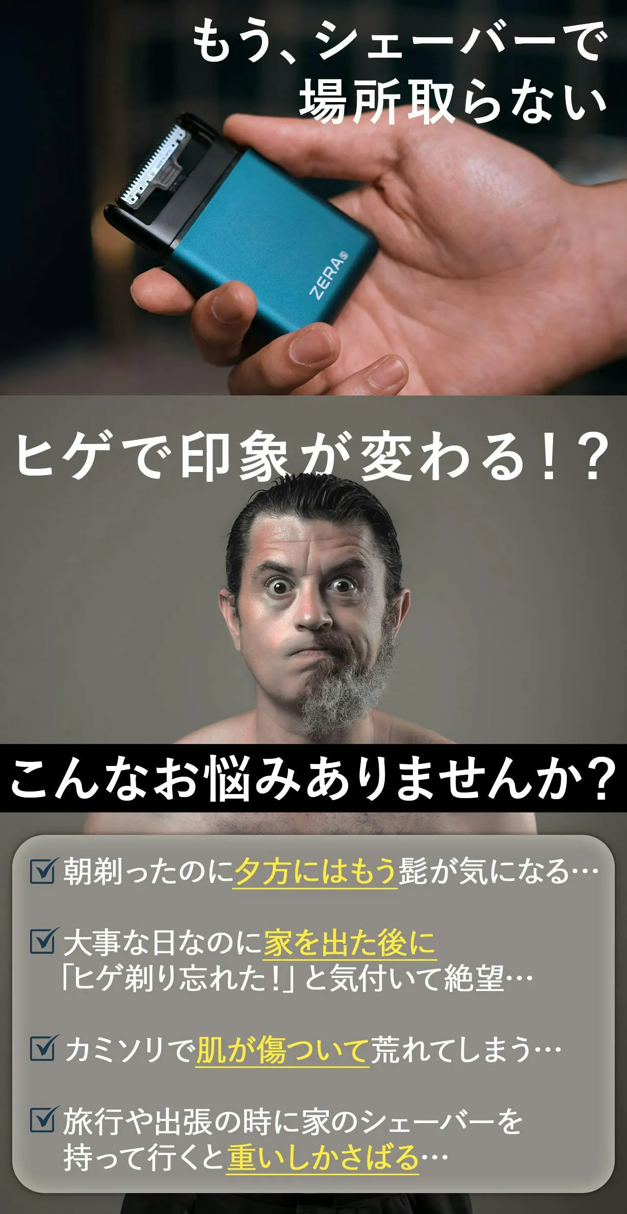 そんな時にZERA S SHAVERがあれば、旅先でも外出中でも荷物を圧迫することなくスムーズなヒゲ剃りが可能です!
