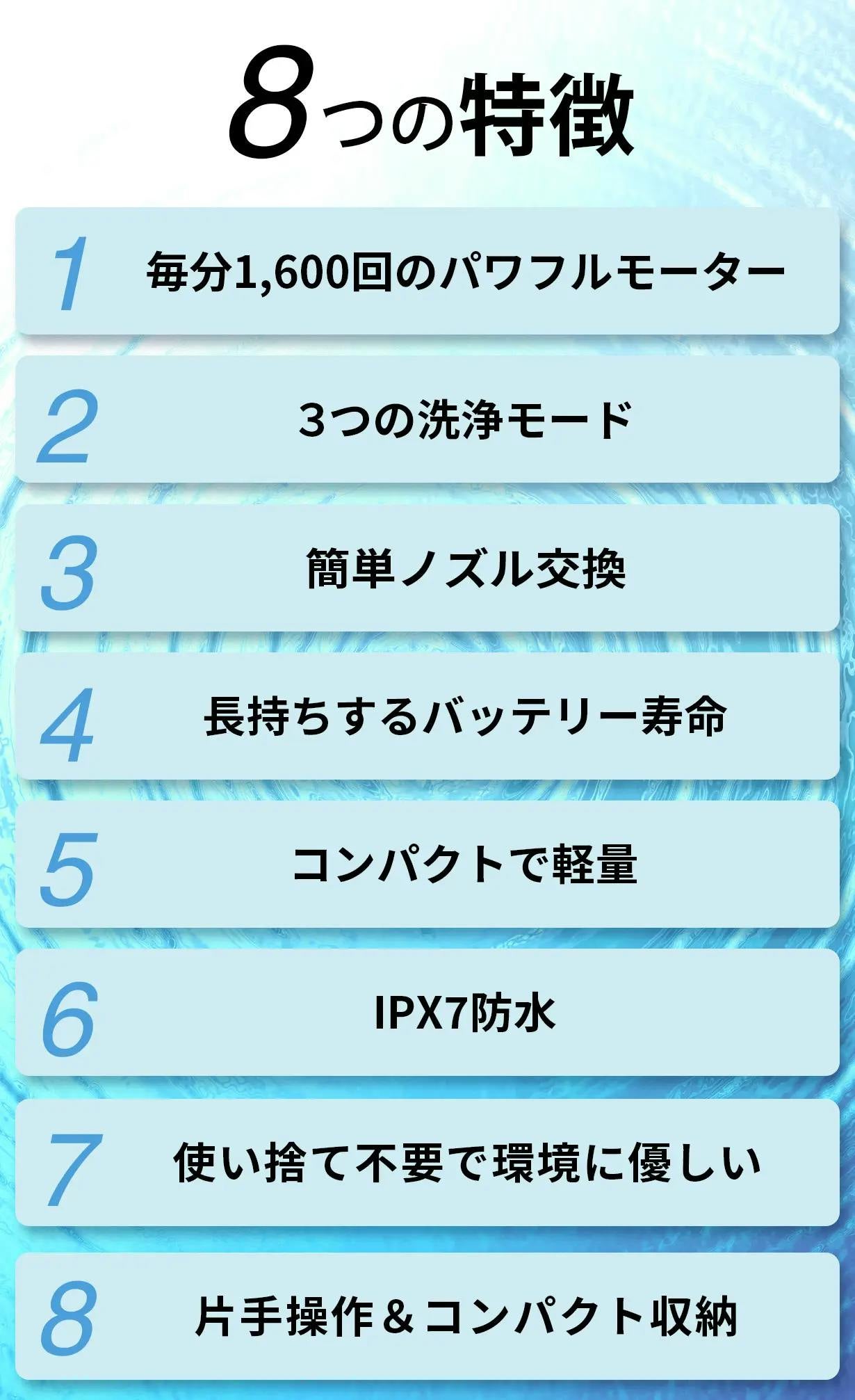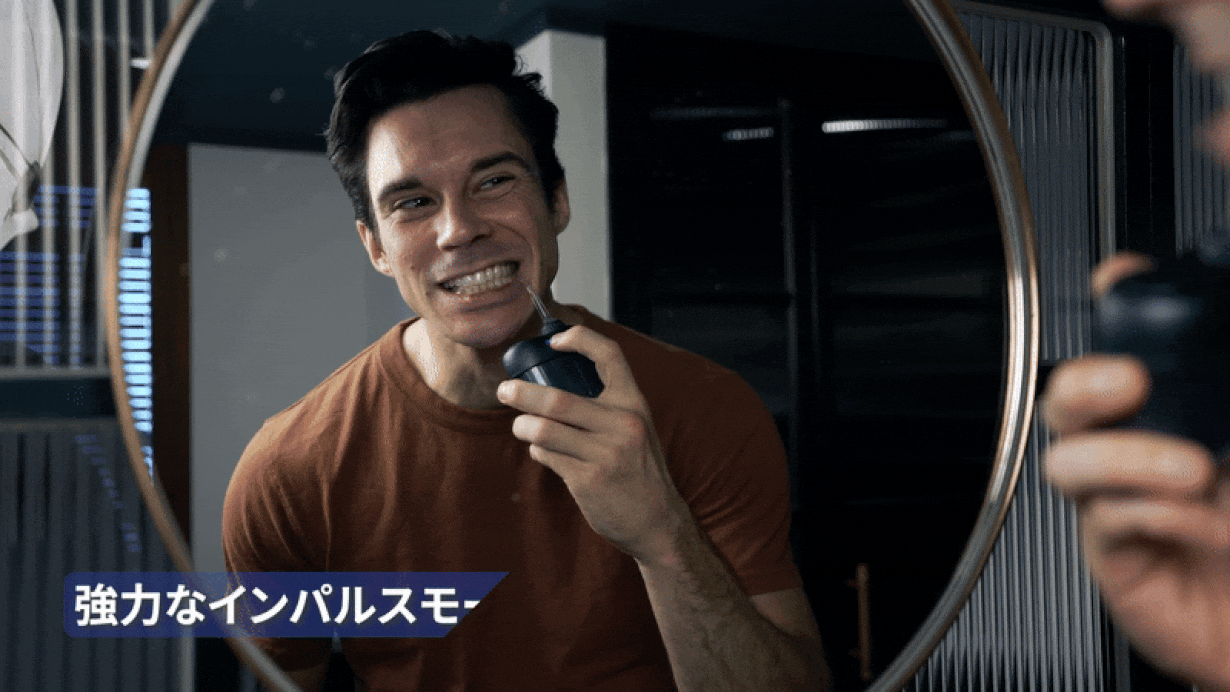人間工学に基づいたデザインで片手でも持ちやすく、モード切り替えもスムーズ。強力な水流が歯の隙間までしっかり届き、歯の健康をサポートします。