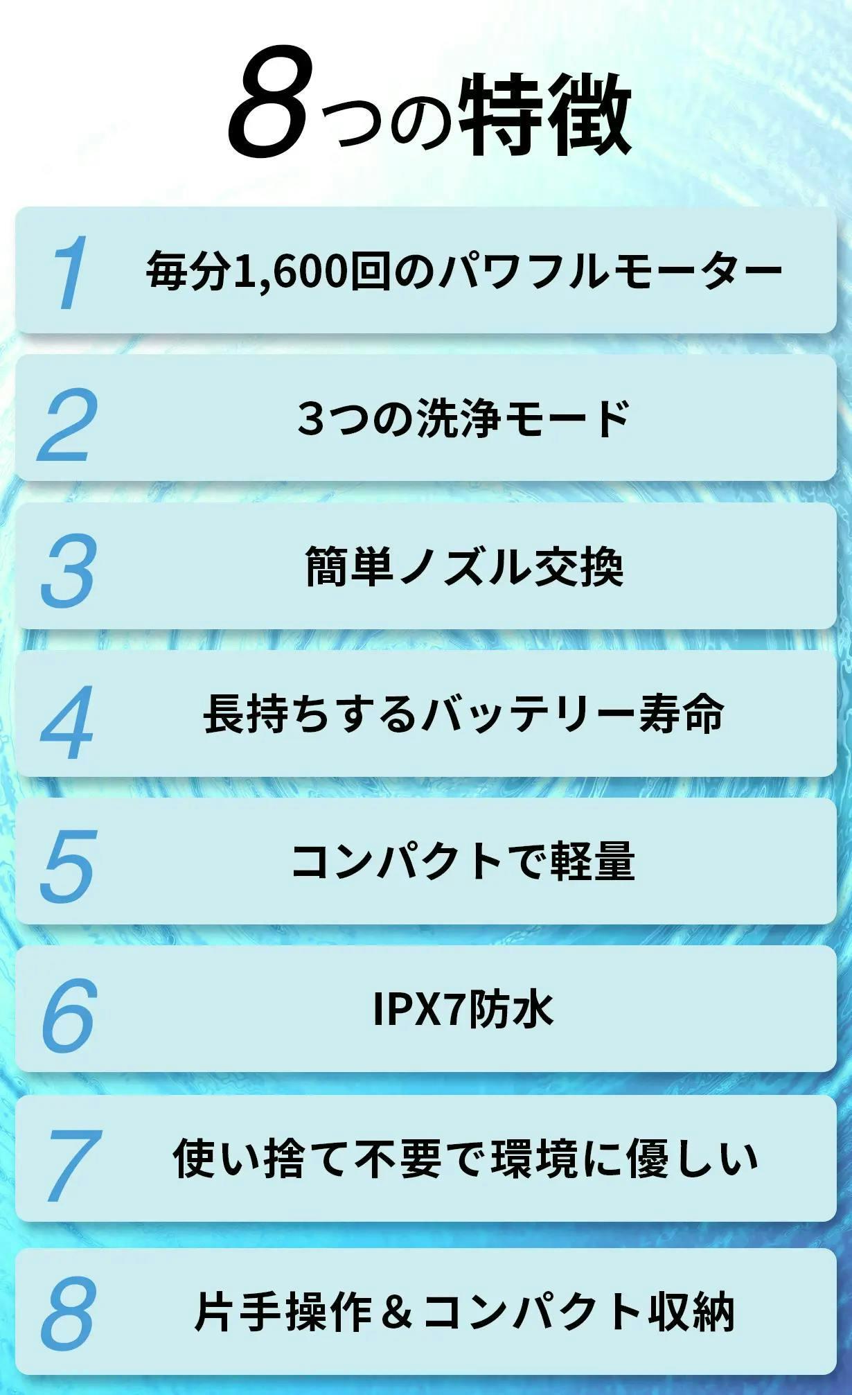 最新のエアポンプ技術により、最大140 PSI、毎分1,600回の強力な水流が、食べかすや歯の表面の汚れを瞬時に洗い流します。コンパクトながら、プロ仕様のパワーを体感できます。