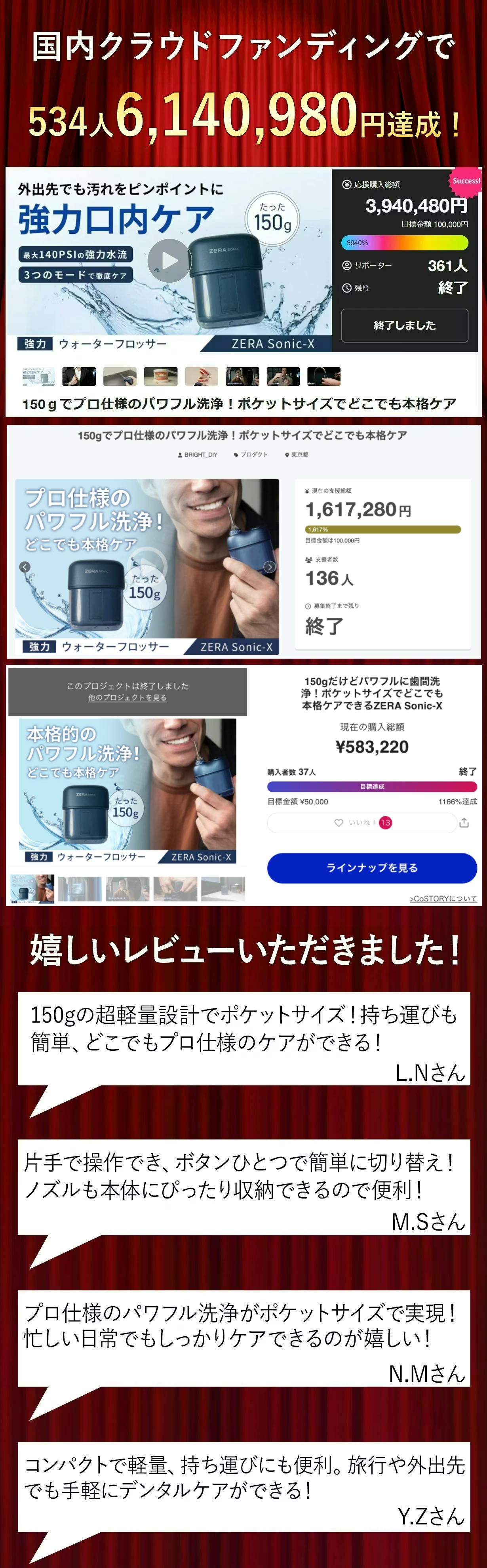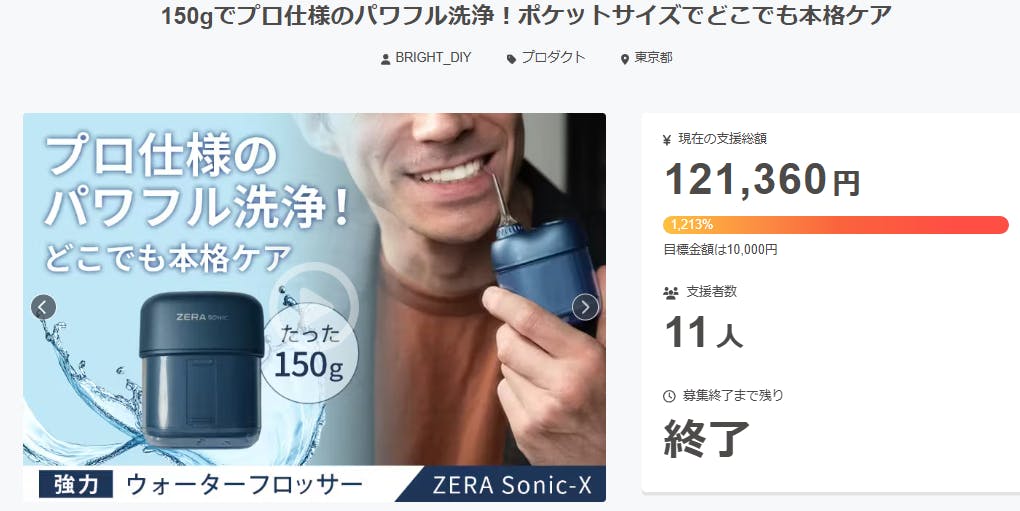2026/03/01 11:29ご支援者様、150gでプロ仕様のパワフル洗浄!ポケットサイズでどこでも本格ケアにご興味をお持ちいただきありがとうございます。プロジェクト開始から35日目で11人ものご支援者の方々より支援頂き、無事プロジェクト終了を迎えることが出来ました。早速皆様のリターンを2026年03月末にお届けできるよう準備を始めております!皆様にご満足いただけるリターンをお届けできるよう、全力で取り組んで参りますので引き続き、「150gでプロ仕様のパワフル洗浄!ポケットサイズでどこでも本格ケア」をよろしくお願い致します。BRIGHTチーム もっと見る