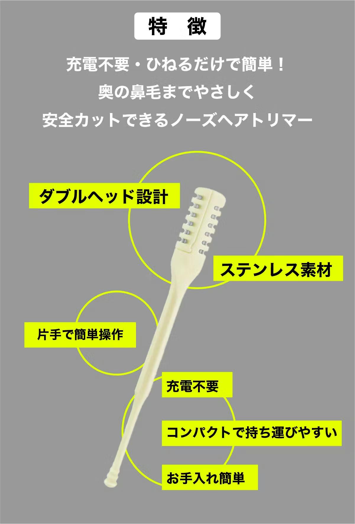 先端には丸型ヘッドを採用し、刃を覆う全面ガード構造によって粘膜を傷つけにくい設計となっています。鼻の中はデリケートな部分だからこそ、安全性は欠かせません。