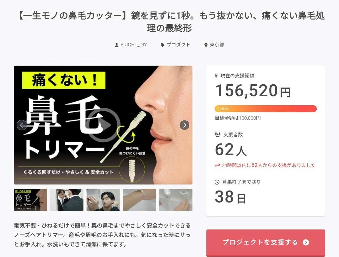 2026/02/21 10:17この度は「【一生モノの鼻毛カッター】鏡を見ずに1秒。もう抜かない、痛くない鼻毛処理の最終形」に支援頂き誠にありがとうございます!お陰様で、開始から40分経たずに10万円の目標金額を100%達成することができました。ご興味のある方、ぜひ支援お願い致します。https://camp-fire.jp/projects/911826/viewBrightチームは、当プロジェクトをもっと多くの方に知っていただきたいと考えております。よかったら、FacebookやTwitter等のSNSでのシェア・拡散をお願い致します。#brightdiyどうぞよろしくお願い致します。Brightチーム もっと見る