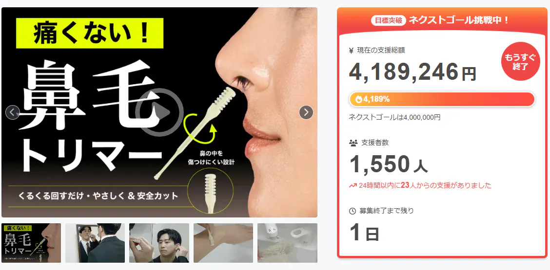 2026/03/30 12:00ご支援者様、【一生モノの鼻毛カッター】鏡を見ずに1秒。もう抜かない、痛くない鼻毛処理の最終形にご興味をお持ちいただきありがとうございます。お陰様で、開始から支援 総額410万円達成することができました!終了までわずか 1 日となります。プロジェクト終了後、「【一生モノの鼻毛カッター】鏡を見ずに1秒。もう抜かない、痛くない鼻毛処理の最終形」をCamfire特別価格で入手することはできなくなりますので、ご支援がまだの方、追加支援をご検討の方はお急ぎくださいますようお願い申し上げます。ご興味のある方、ぜひ支援お願い致します。https://camp-fire.jp/projects/911826/viewBrightチームは、当プロジェクトをもっと多くの方に知っていただきたいと考えております。よかったら、FacebookやTwitter等のSNSでのシェア・拡散をお願い致します。#brightdiyどうぞよろしくお願い致します。Brightチーム もっと見るさまざまなシーンで活躍する身だしなみケア