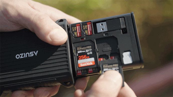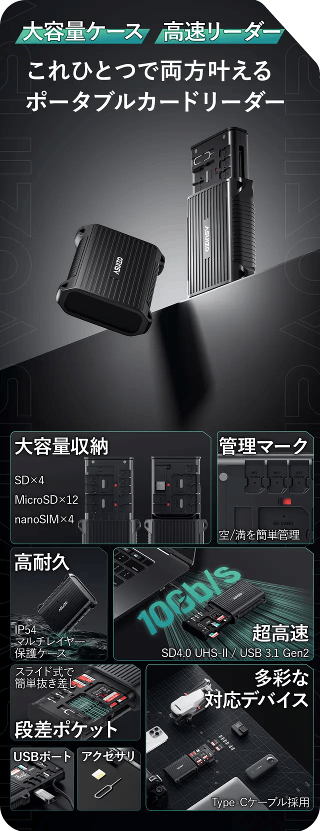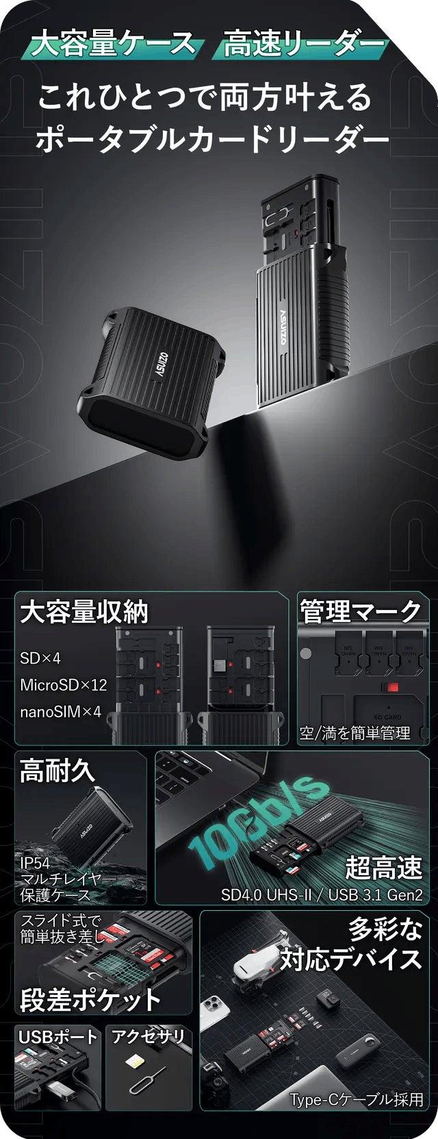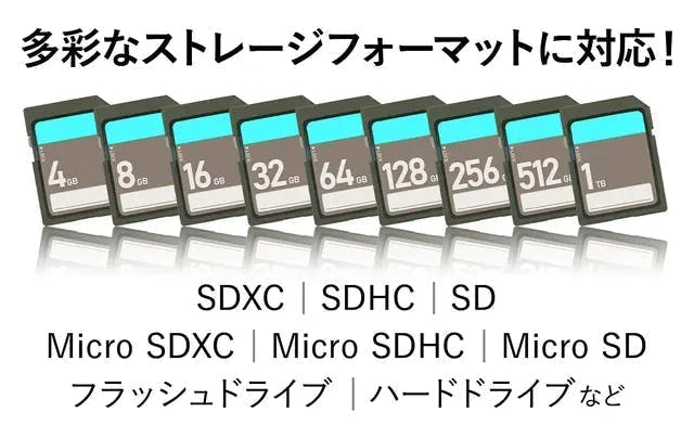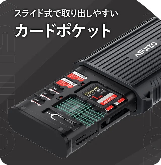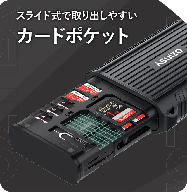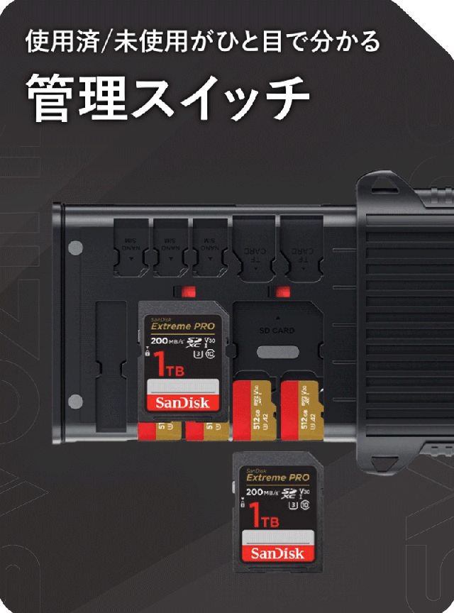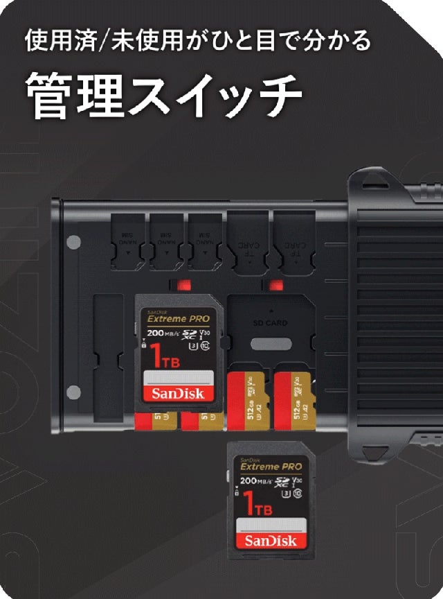 大容量SDカード×4、Micro SDカード×12、Nano SIMカード×4を収納可能!