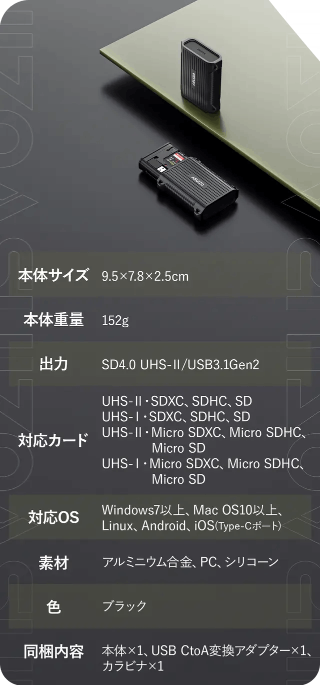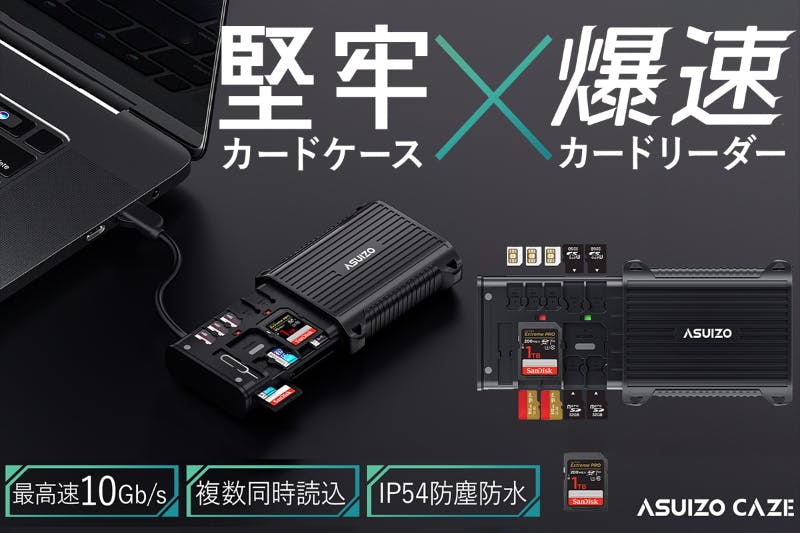 A:CAZEは、最大312MB/秒のSD4.0 UHS-IIおよび、最大10Gb/秒のUSB 3.1 Gen 2を搭載しています。(最大速度のため、ご使用の環境により異なります。)