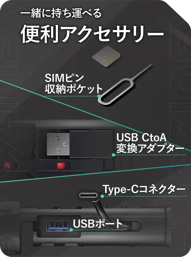 さらに、SIMピン、USBアダプター用のポケットもあり、付属品も一緒に持ち運べます。