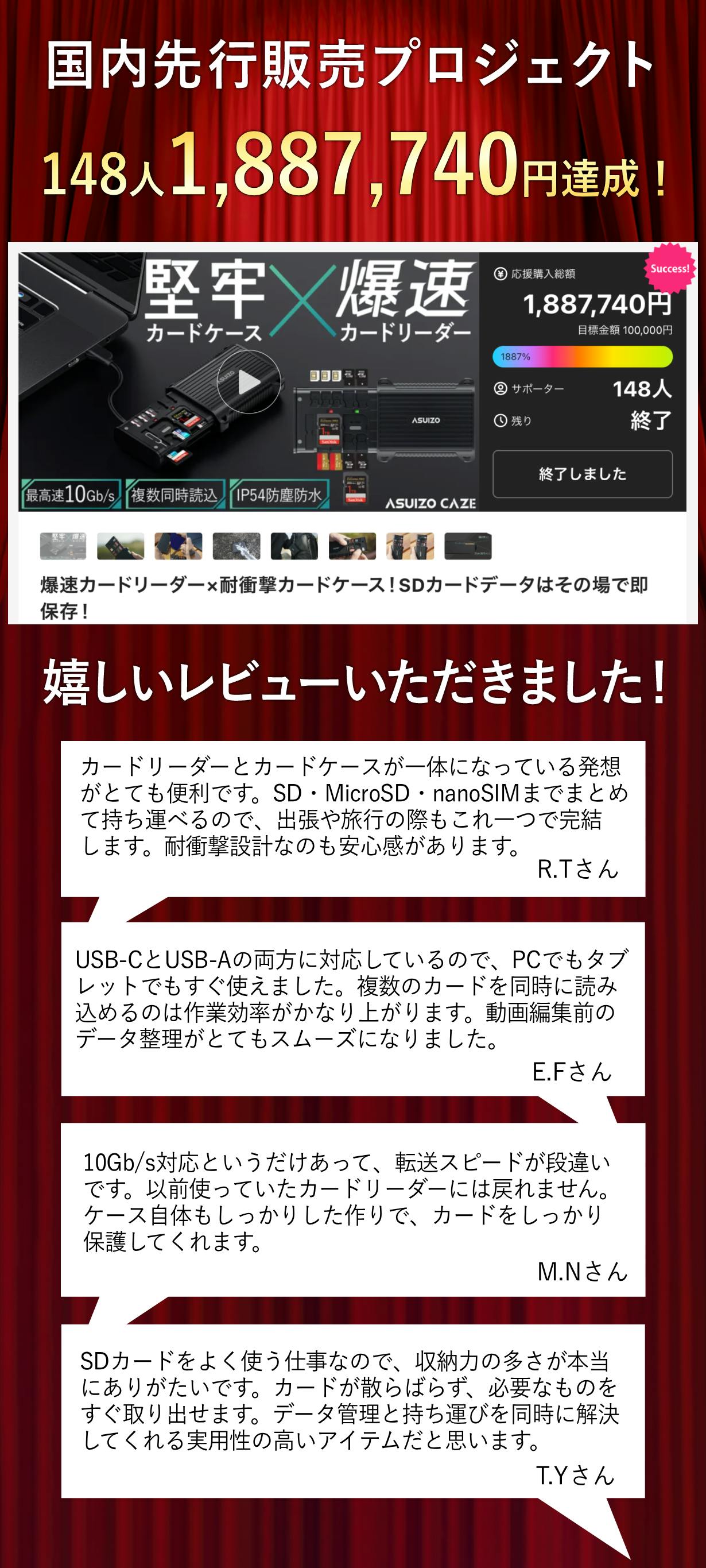 2026/03/01 11:16ご支援者様、爆速カードリーダー×耐衝撃カードケース!SDカードデータはその場で即保存!にご興味をお持ちいただきありがとうございます。プロジェクト開始から45日目で24人ものご支援者の方々より支援頂き、無事プロジェクト終了を迎えることが出来ました。早速皆様のリターンを2026年03月末にお届けできるよう準備を始めております!皆様にご満足いただけるリターンをお届けできるよう、全力で取り組んで参りますので引き続き、「爆速カードリーダー×耐衝撃カードケース!SDカードデータはその場で即保存!」をよろしくお願い致します。BRIGHTチーム もっと見る