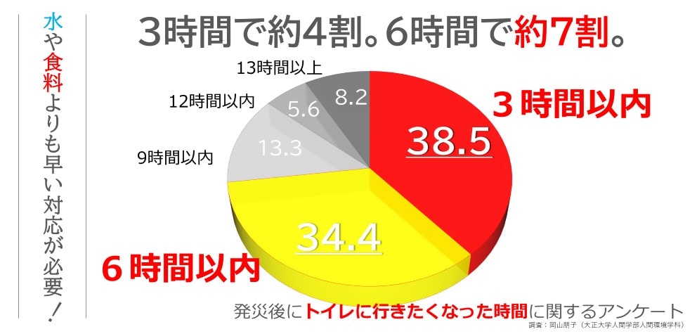 過去の災害では、災害発生から3時間以内に約4割が、さらに6時間以内では約7割がトイレに行きたくなったという調査結果があります。つまり、水や食料よりも先にトイレ対応が必要になるということ。