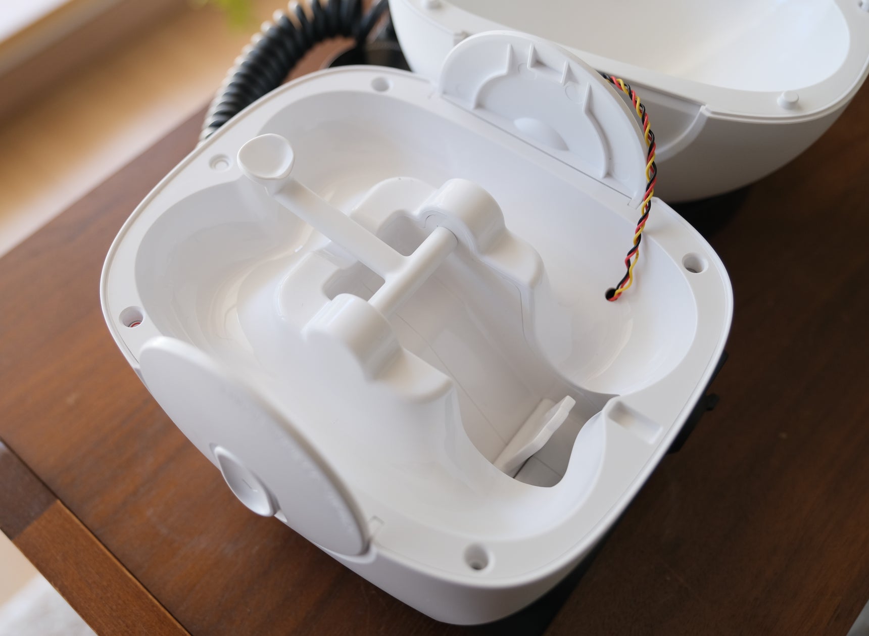 汚れがちなおやつ皿は取り外して丸洗いOK。でっぱりもなく洗いやすい樹脂素材です。