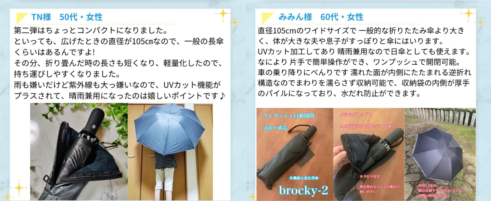 2025/12/22 12:00今回は、皆さまから寄せられそうな質問をまとめた brocky-3 の Q&A 特集 をお届けします。ーーーーーーーーーーーーQ1. brocky‑3はどんな折りたたみ傘ですか?brocky‑3 は 「瞬速ワンプッシュ自動開閉」 機構を備えた最新モデルです。片手でボタンを押すだけで サッと開閉 でき、持ち歩きも収納もラクラク。強化された 10本骨構造 と 3層+2層構造 により、強風でも反り返りにくいタフさを実現しています。Q2. リンググリップは何が便利なの?リンググリップはハンドル根元がリング状になっているため、バッグやデスクの角に掛けるだけで自立します。Q3. 強風で壊れにくい理由を教えてください。従来の折りたたみ傘よりも強化された 10本骨構造を採用。さらに 3層骨+2層骨の多層フレーム で風圧を分散し、逆反りを防ぎます。これにより、強風時でも壊れにくい耐久性を確保しています。Q4. 開閉スピードはどれくらい?片手でボタンを押すだけで即座に開閉!荷物で片手がふさがっていても ワンプッシュで操作可能です。急な雨にも安心のスピーディーな開閉になっています。Q5. サイズと重さは?開いたとき:直径約 105 cm × 高さ 68 cm収納時:幅 6 cm × 長さ 35 cm重さ:約480g(ケース+40g)Q6. 発送はいつ頃ですか?プロジェクト終了後になるので、2026年3月末までに発送予定です。Q7. どんな人に向いている傘?・通勤・通学で両手がふさがりがちな方・風の強い地域や台風シーズンでも安心したい方・車や電車移動が多く、濡れた傘の置き場に困る方・荷物を減らしたいミニマリスト、出張や旅行が多い方こんな方々にピッタリな brocky-3。ぜひプロジェクトページで詳細をご覧ください!ーーーーーーーーーーーーさらに今回は、お得にご購入いただける「割引クーポン」もご用意していますので、ぜひこの機会にご利用ください。引き続き、応援よろしくお願いいたします!<brocky最新プロジェクトの詳細はこちら>↓ ↓ ↓https://camp-fire.jp/projects/911916/view もっと見る