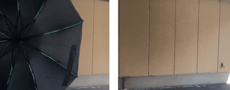 通常の傘は雨粒を振り落としても、どうしても傘に残ってしまい、置くと周りを濡らしてしまいます。