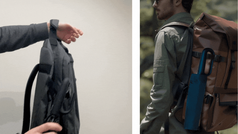 → バックパックに簡単に取り付けられるので、持ち運びが楽で置き忘れ防止にもつながる。