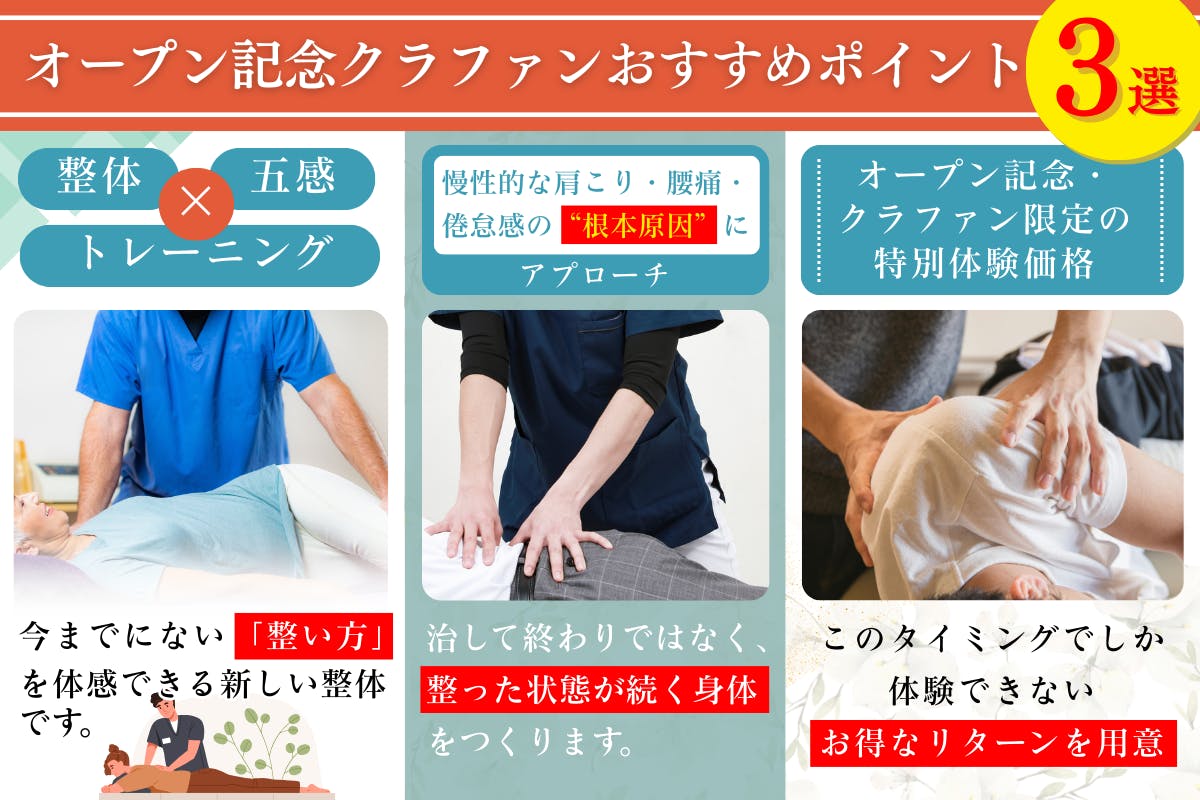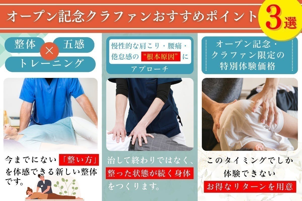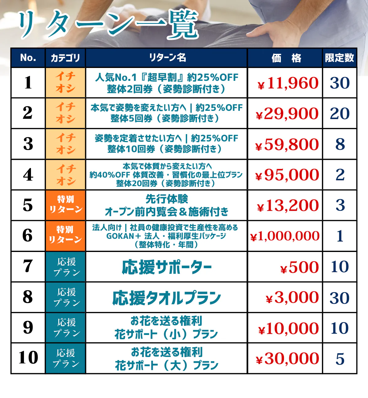 GOKAN+が提供する「整体 × 姿勢診断 × 五感アプローチ」を実際に体感いただける、クラウドファンディング限定の特別チケットです。