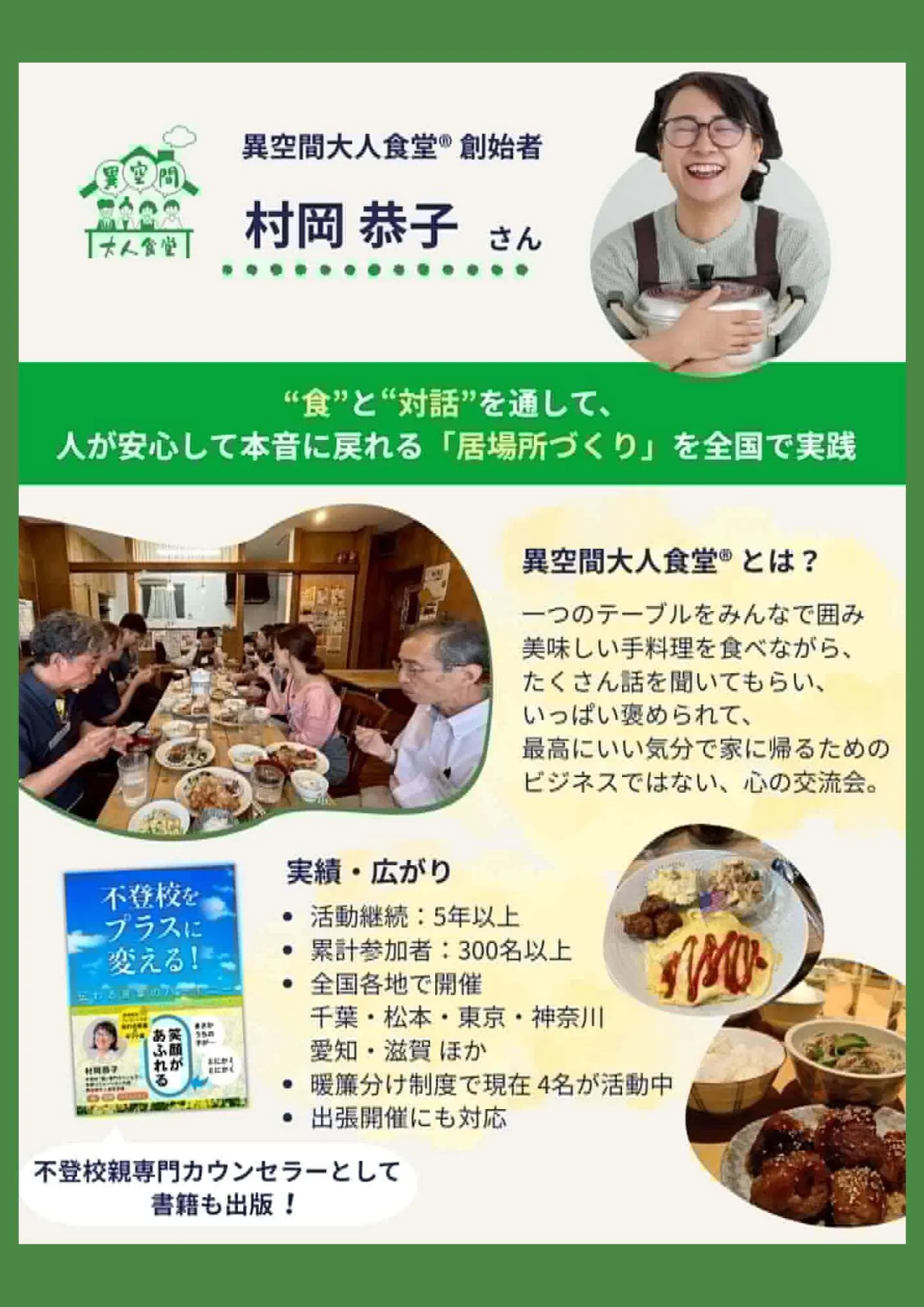 「異空間大人食堂®️」とは村岡恭子氏が主宰する、“食”と“対話”を通して、心理的安全性が担保された食堂という名の「場」における心の交流会です。