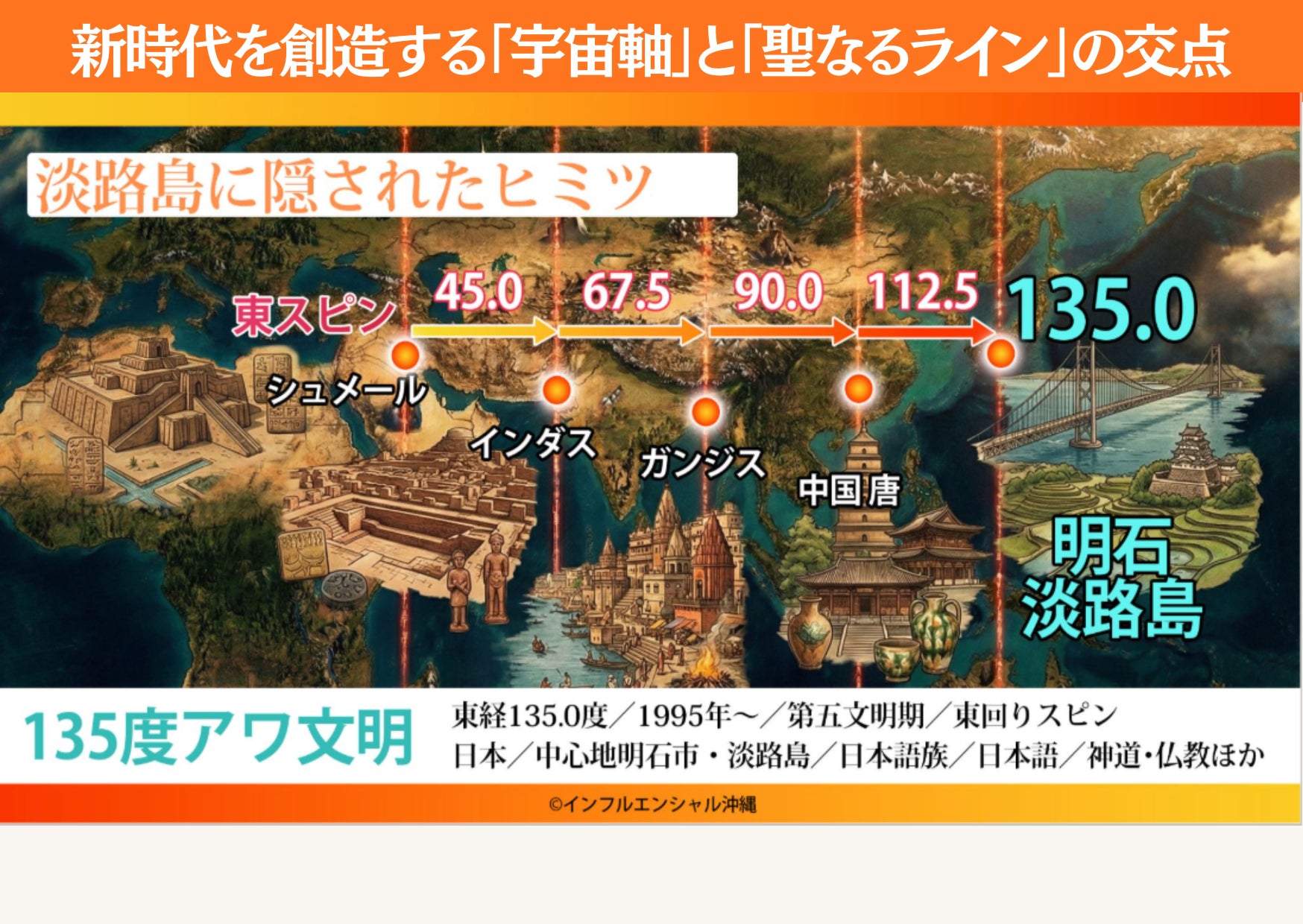 淡路島は、日本の標準時を定める東経135度線(子午線)上にあります。 - 1611年周期により聖なるリズムとして22.5度ずつ西と東に移動していきます。