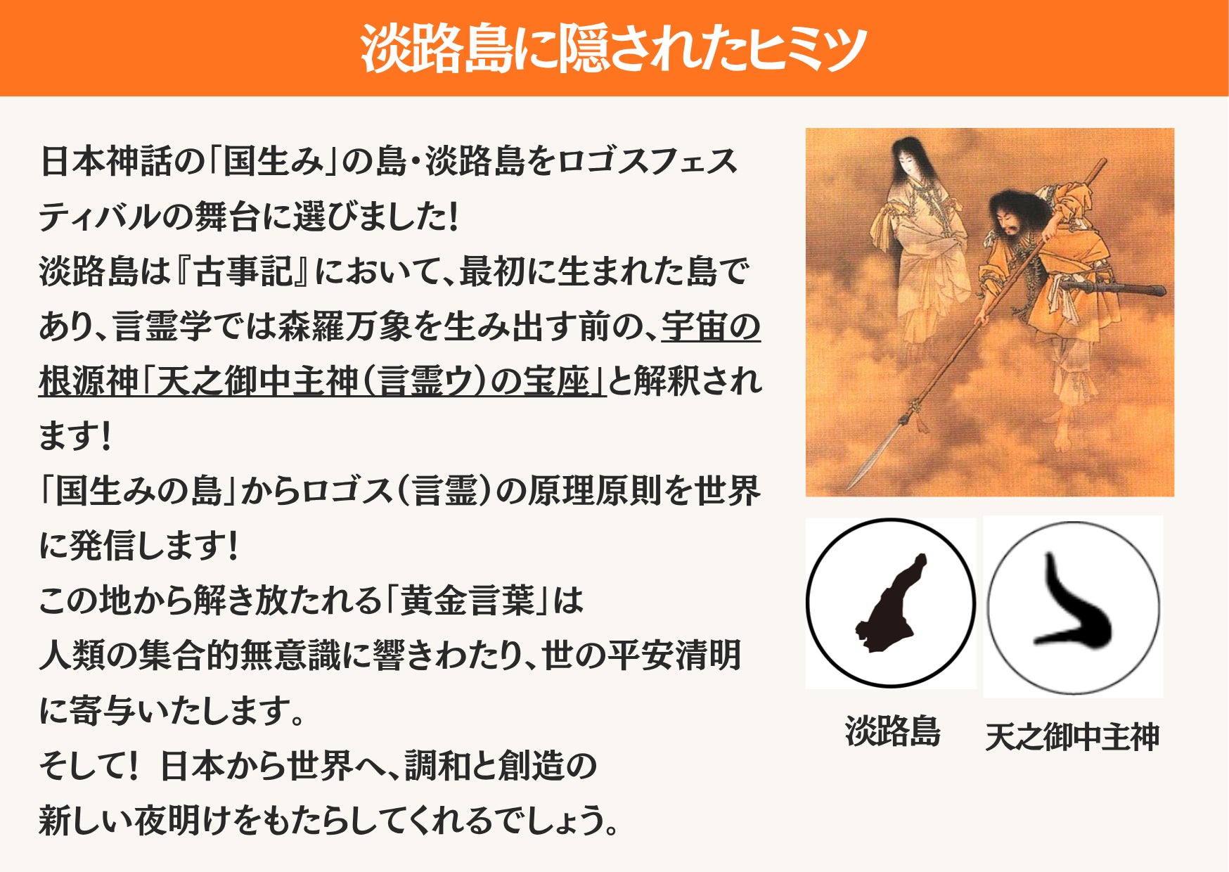 「国生みの島・淡路島」から、基調講演を通して、ロゴス(言霊)の原理原則を世界に発信します。