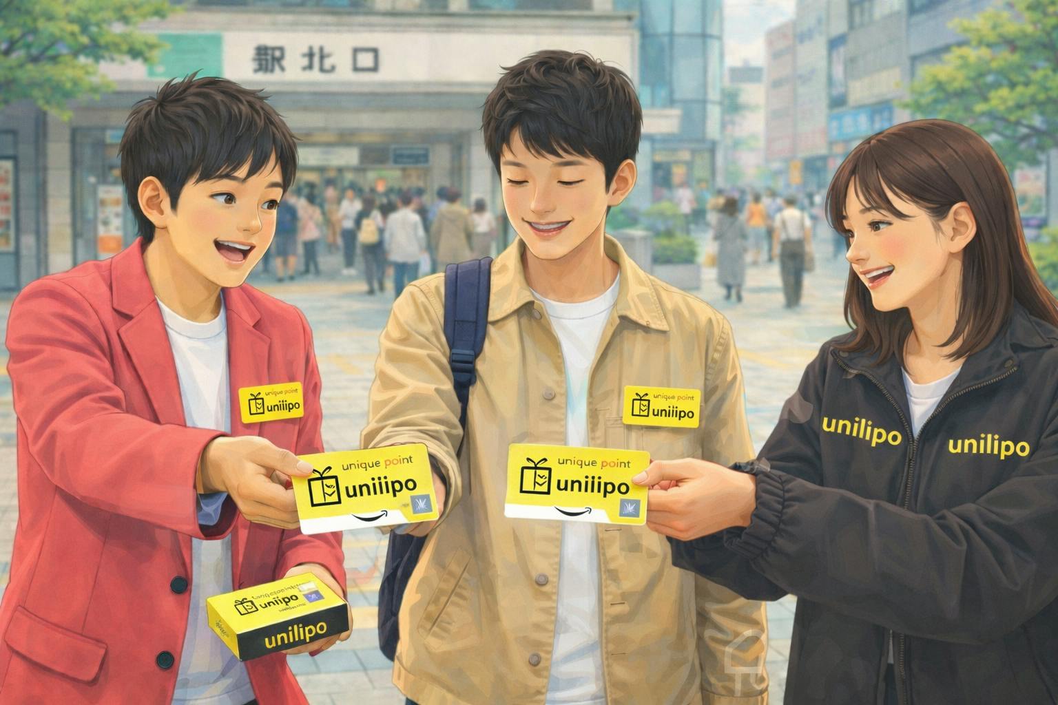 ユニーポは、広告主様の商品やサービスの広告デザインが入ったAmazonギフトカード(額面50円のバリュー付き)を広告主様のターゲットがいそうな場所(駅前やイベント会場付近など)で、対象となりそうな消費者の方に“直接手渡し”でお届けする新しい広告です。