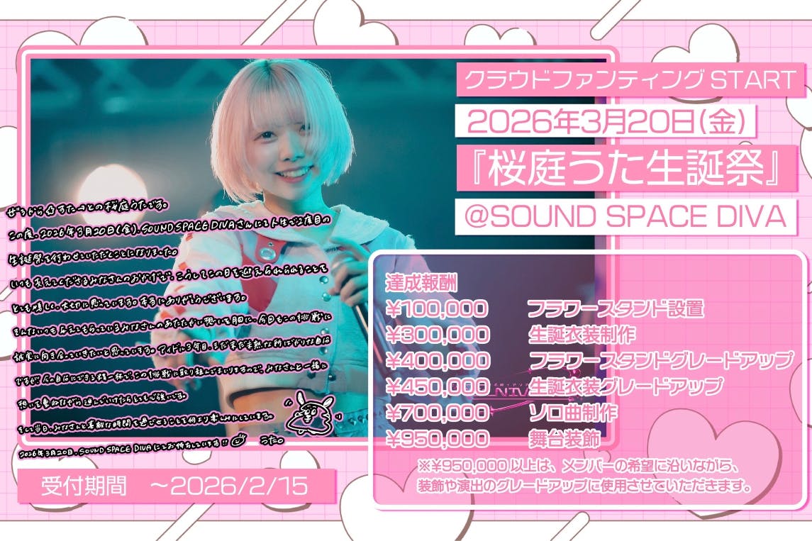 2026年3月20日に名古屋SOUND SPACE DIVAで開催されるアイドル「桜庭うた」の生誕祭です。今回は、彼女の生誕祭を成功させるために、彼女を応援する全てのファンの力を集結させたいと考えています。