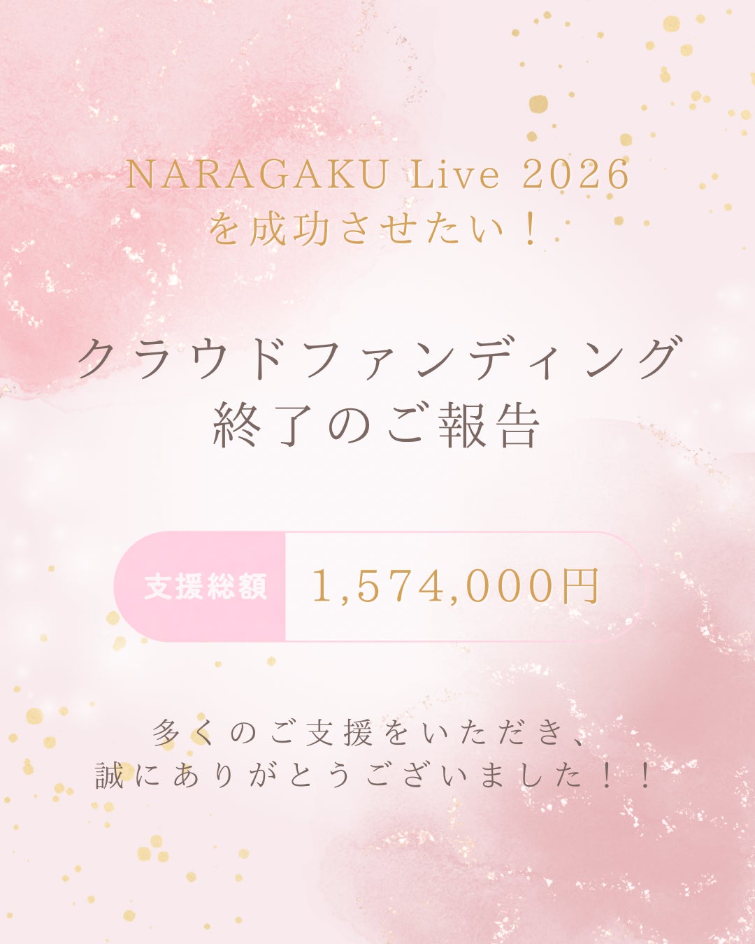 この度は、「NARAGAKU Live 2026」に際し、クラウドファンディングへのご支援ならびに拡散にご協力いただき、誠にありがとうございました。皆様からの多大なるご支援と温かい応援のおかげで、無事に演奏会を終えることができました。本番を迎えるまでの過程においても、皆様からのご支援や励ましのお言葉が、私たちの大きな原動力となり、最後まで走り抜く力となりました。この演奏会を通して感じた皆様との繋がり、そして支えていただいているという実感は、これからの活動において何よりの財産です。今後も感謝の気持ちを忘れず、より良い演奏を目指して部員一同精進してまいります。引き続き温かいご声援のほど、よろしくお願い申し上げます。