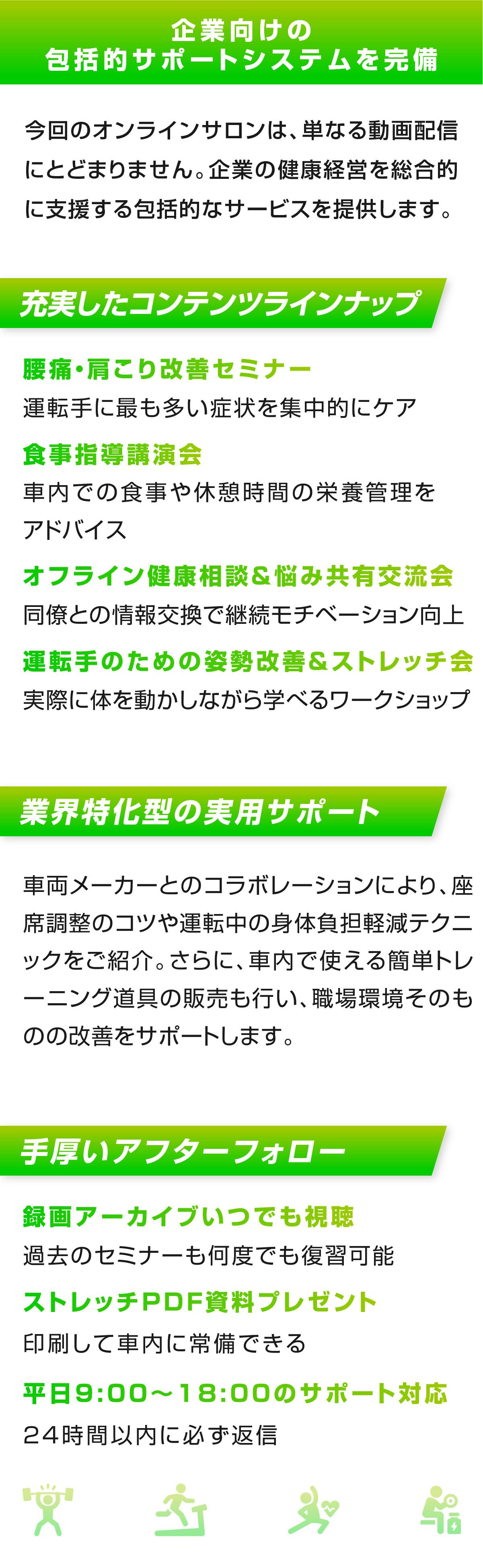 だからこそ今回のサロンでは、運転手の動き・環境・勤務特性に合わせた完全特化型のプログラムをご用意しています。