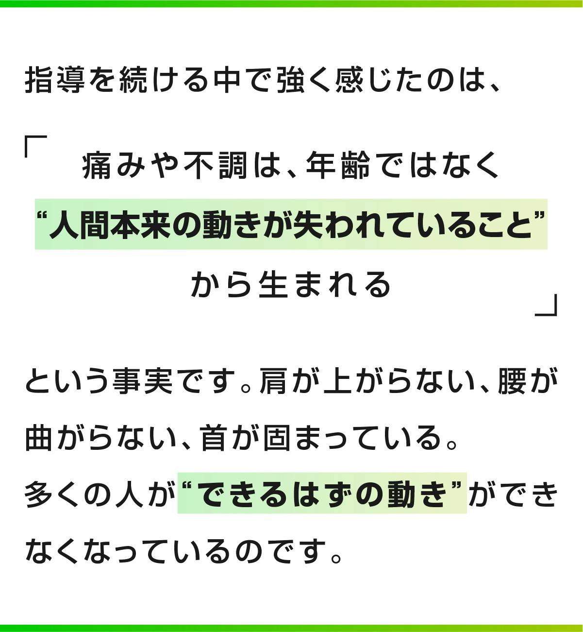 「痛みや不調は、年齢ではなく人間本来の動きが失われていることから生まれる」という信念を持つようになりました。