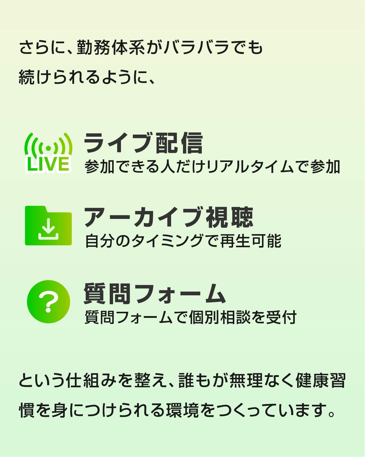 働き続けられる身体づくりを習慣化していくための仕組みです。