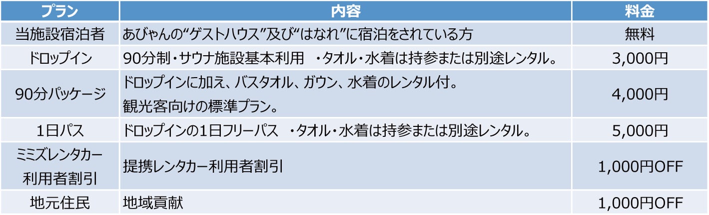 水着:500円、ガウン:500円、バスタオル:200円、手ぶらセット(水着・ガウン・バスタオル):1,000円