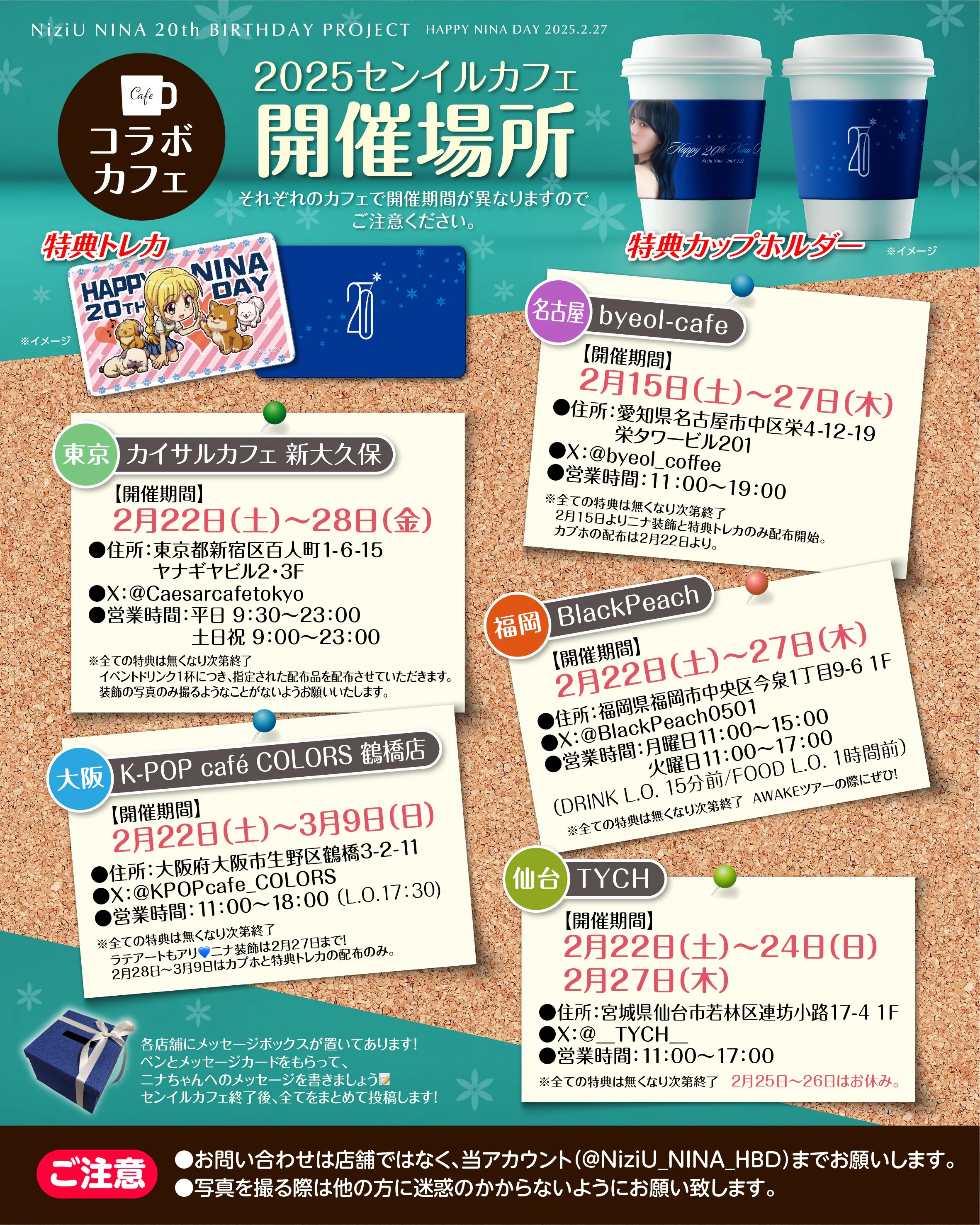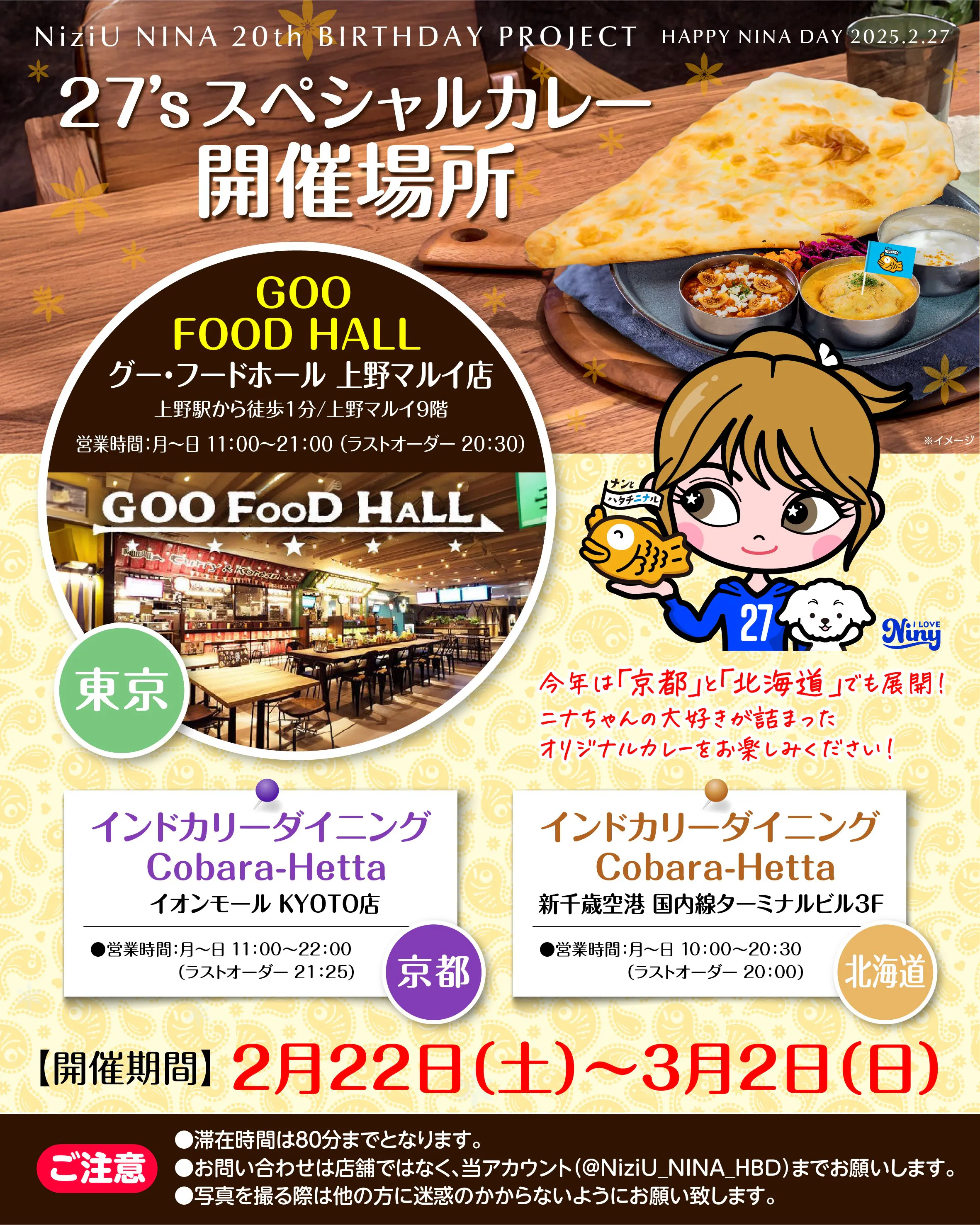 2026/02/18 21:46支援者の皆様お世話になっております。ニナ誕生日企画です。ニナちゃんの大好きなチーズバーガーとポテトフライのコラボの詳細を公開しました!詳細は下記画像よりご確認のほどよろしくお願いします!①場所:GOO FOOD HALL 上野マルイ店期間:2/21~3/1例年、カレーコラボを行っていたお店と同じ場所になります。②場所 :ビストロ Cobara Hetta期間:2/26〜3/1北海道店はNiziUのPOP UP in HMVと同じ建物 札幌ステラプレイスにありますので沢山のWithUにお越しいただけますと幸いです☺︎上野にはニナバナーも!各店舗に広告ポスターも掲載いたします! XとInstagramにも投稿しておりますので拡散いただけますと幸いです。ニナちゃんとお誕生日を一緒に盛り上げていきましょう!以上、何卒よろしくお願いします。ニナ誕生日企画 もっと見る