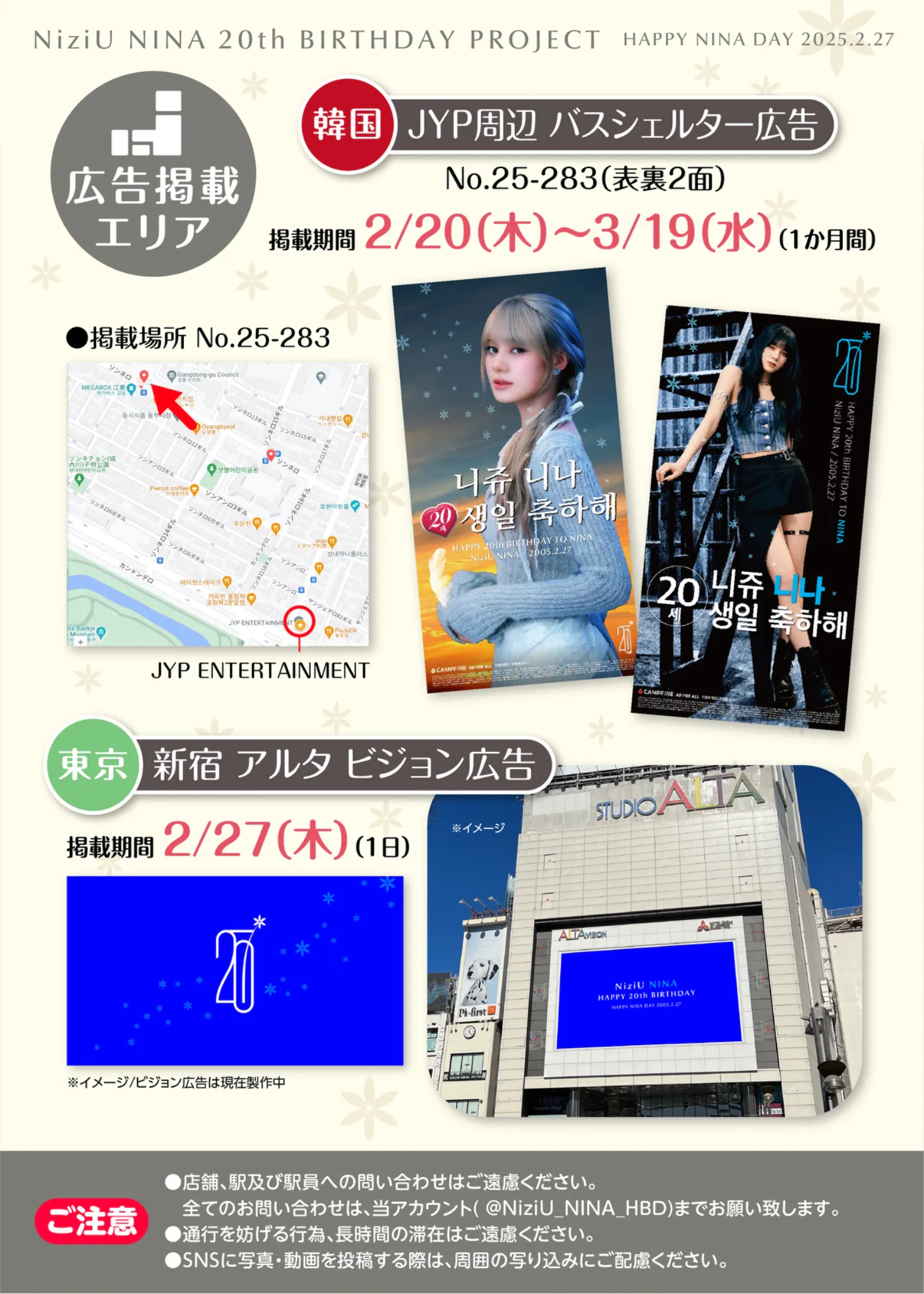 2026/02/11 13:20支援者の皆様いつもお世話になっております。ニナ誕生日企画です。2/7(土)〜3/6(金)の間、韓国にてニナちゃんのポスターを掲載中!JYP付近にあり、詳細は、下記掲載エリアの画像よりご確認のほどよろしくお願いします。ぜひたくさんの方に見に行ってくだされば嬉しいです☺︎以上、何卒よろしくお願いします。ニナ誕生日企画 もっと見る