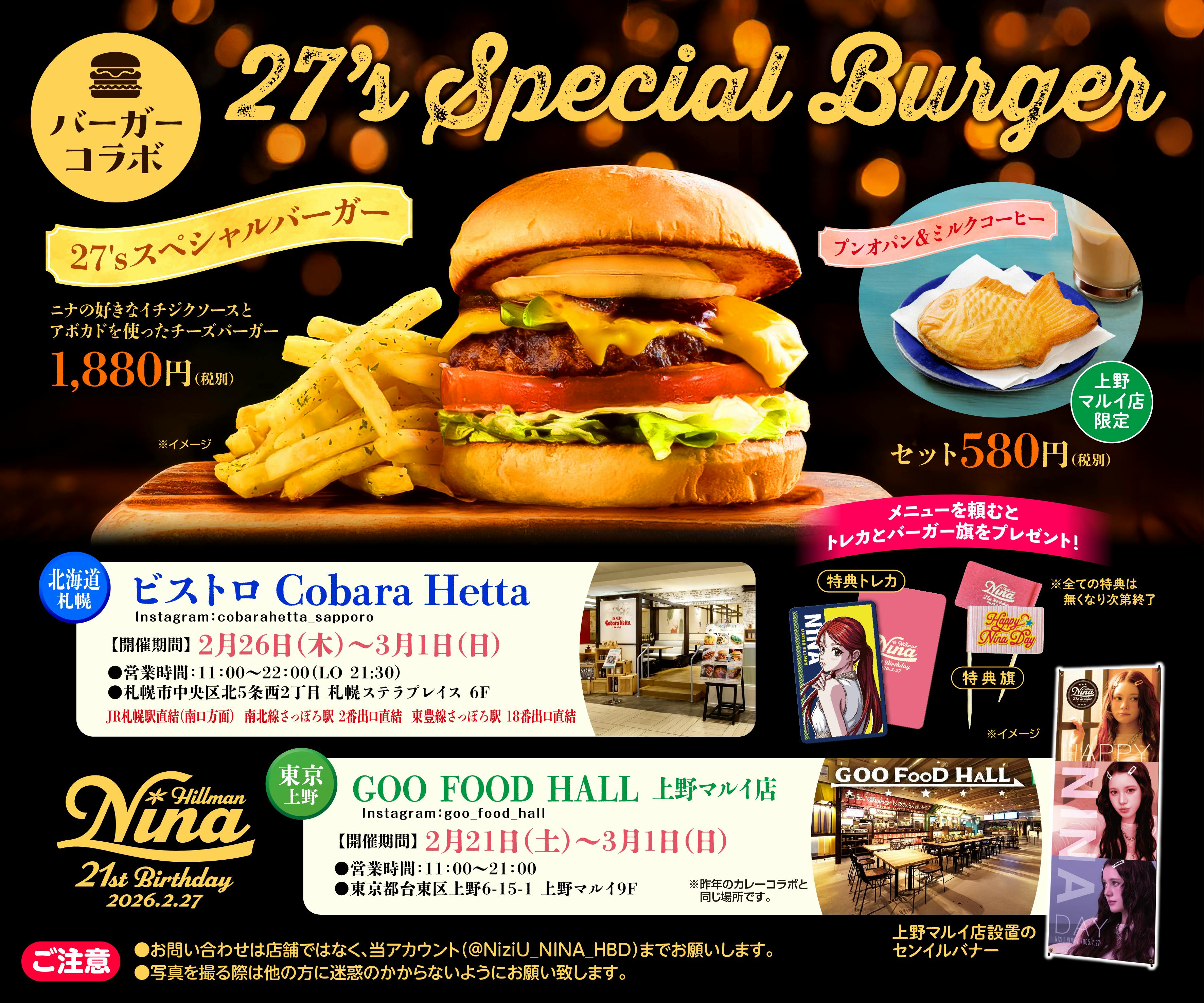 2026/02/18 21:46支援者の皆様お世話になっております。ニナ誕生日企画です。ニナちゃんの大好きなチーズバーガーとポテトフライのコラボの詳細を公開しました!詳細は下記画像よりご確認のほどよろしくお願いします!①場所:GOO FOOD HALL 上野マルイ店期間:2/21~3/1例年、カレーコラボを行っていたお店と同じ場所になります。②場所 :ビストロ Cobara Hetta期間:2/26〜3/1北海道店はNiziUのPOP UP in HMVと同じ建物 札幌ステラプレイスにありますので沢山のWithUにお越しいただけますと幸いです☺︎上野にはニナバナーも!各店舗に広告ポスターも掲載いたします! XとInstagramにも投稿しておりますので拡散いただけますと幸いです。ニナちゃんとお誕生日を一緒に盛り上げていきましょう!以上、何卒よろしくお願いします。ニナ誕生日企画 もっと見る