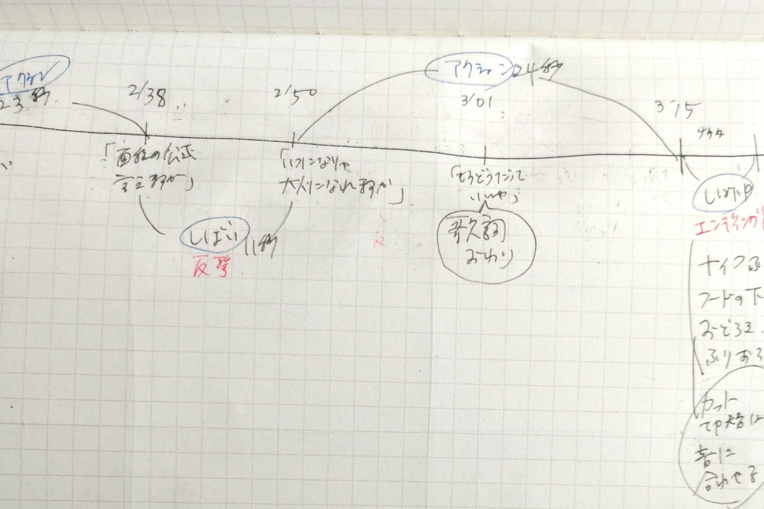 この間、絵コンテをとにかく描いてみて「こんなシーンが撮りたいな」ということと、アクションとお芝居のシーン分けがちょっと見えてきました。企画を始めたころは、歌詞と曲の雰囲気からふわっとイメージで考えていて、明確なストーリー展開はなく。でも曲を繰り返し聞きながら、最初に描いた絵コンテをたたき台にして、とにかくお芝居シーンを当てはめていってみると、ストーリーの輪郭が見えてきた!手ごたえがあると、また一歩進んだ感じがしてうれしいです。
