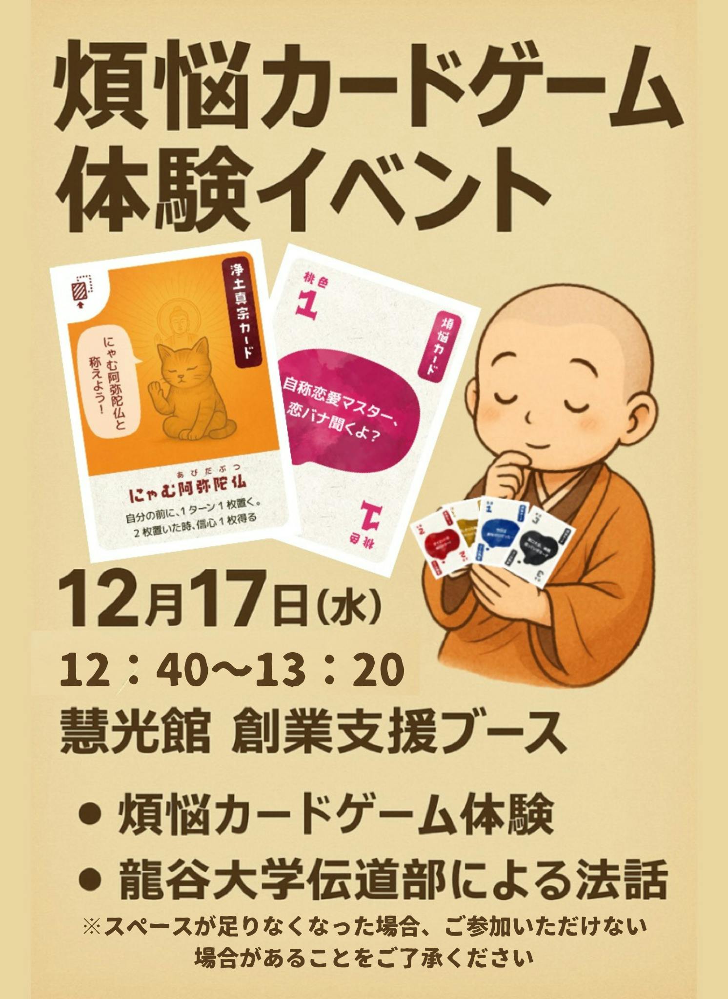 また、90年以上の歴史を持つ学生団体「伝道部」にご参加いただき、本カードゲームの体験会と、伝道部による法話イベントを開催しました。