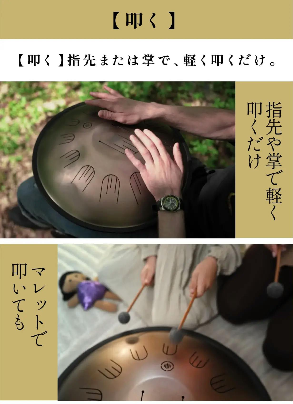 初心者の方でも、どちらの面を叩いても美しい音色が広がり、すぐに癒しの時間に。