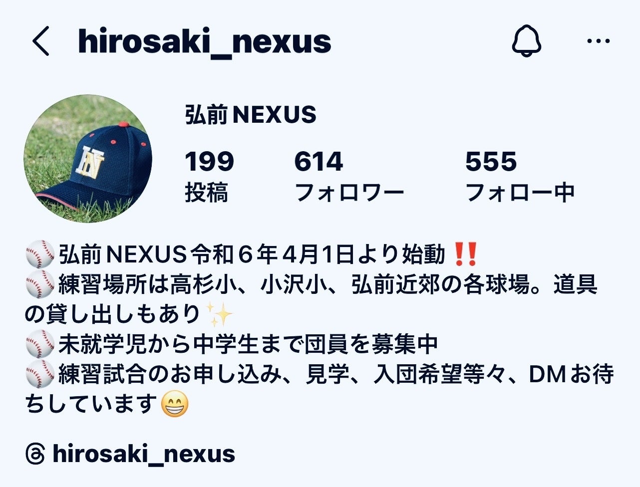 私たちは「弘前NEXUS」は、青森県弘前市に拠点を置く、創部2年目の保育園児から中学生まで“地域の子どもたちが長くつながり続けられる”野球チームです。地域の子どもたちにスポーツを通じて成長の機会を提供し、チームワークやコミュニケーション能力を育むことを目的としています。青森県という厳しい冬の環境の中でも、子どもたちが夢を追い続けられるように、監督・コーチ陣・保護者も団結して、選手と共に日々努力を重ねています。雪国ならではの苦労とともに、子どもたちの挑戦を応援いただければ幸いです。