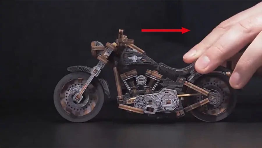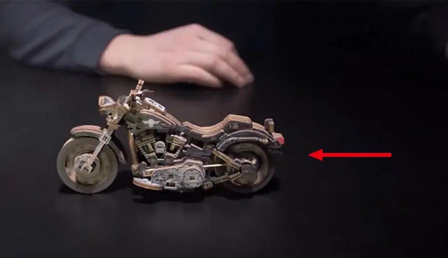 組み立てたバイクが、プルバック式の仕組みで約1mを走行。精密なギア連動による、本格的な走りの仕組みをご紹介!