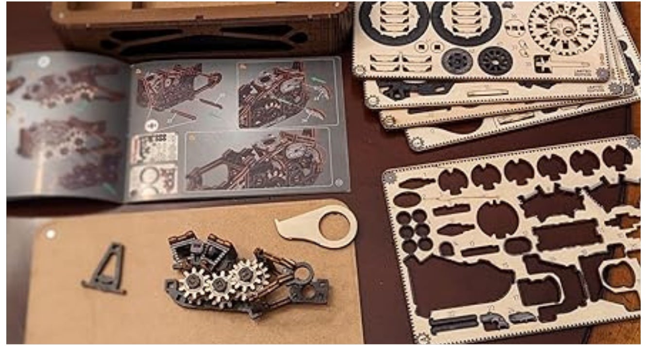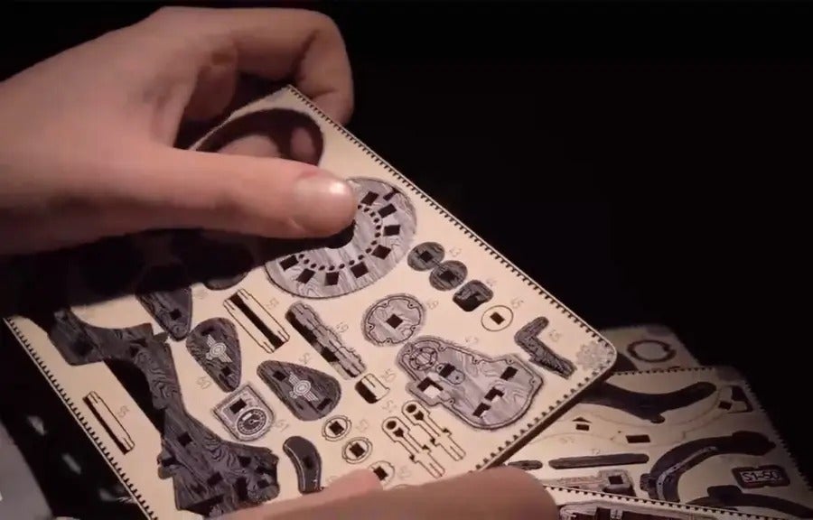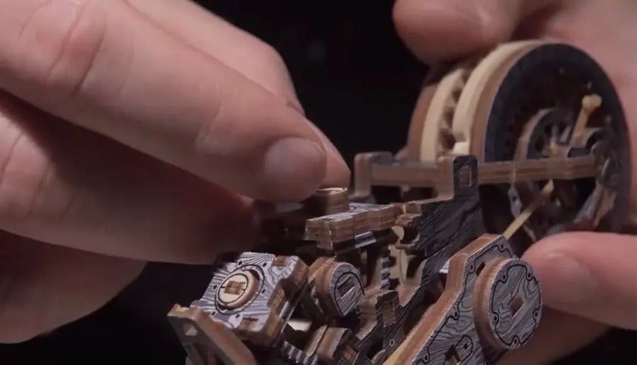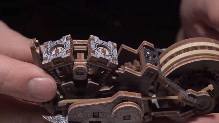 天然木の168個のパーツは、ジョイント部分もすべて木製で作られています。カチッと噛み合い、歯車が連動していく感触は格別。指先で感じる精密な動きに、思わず夢中になってしまいます。